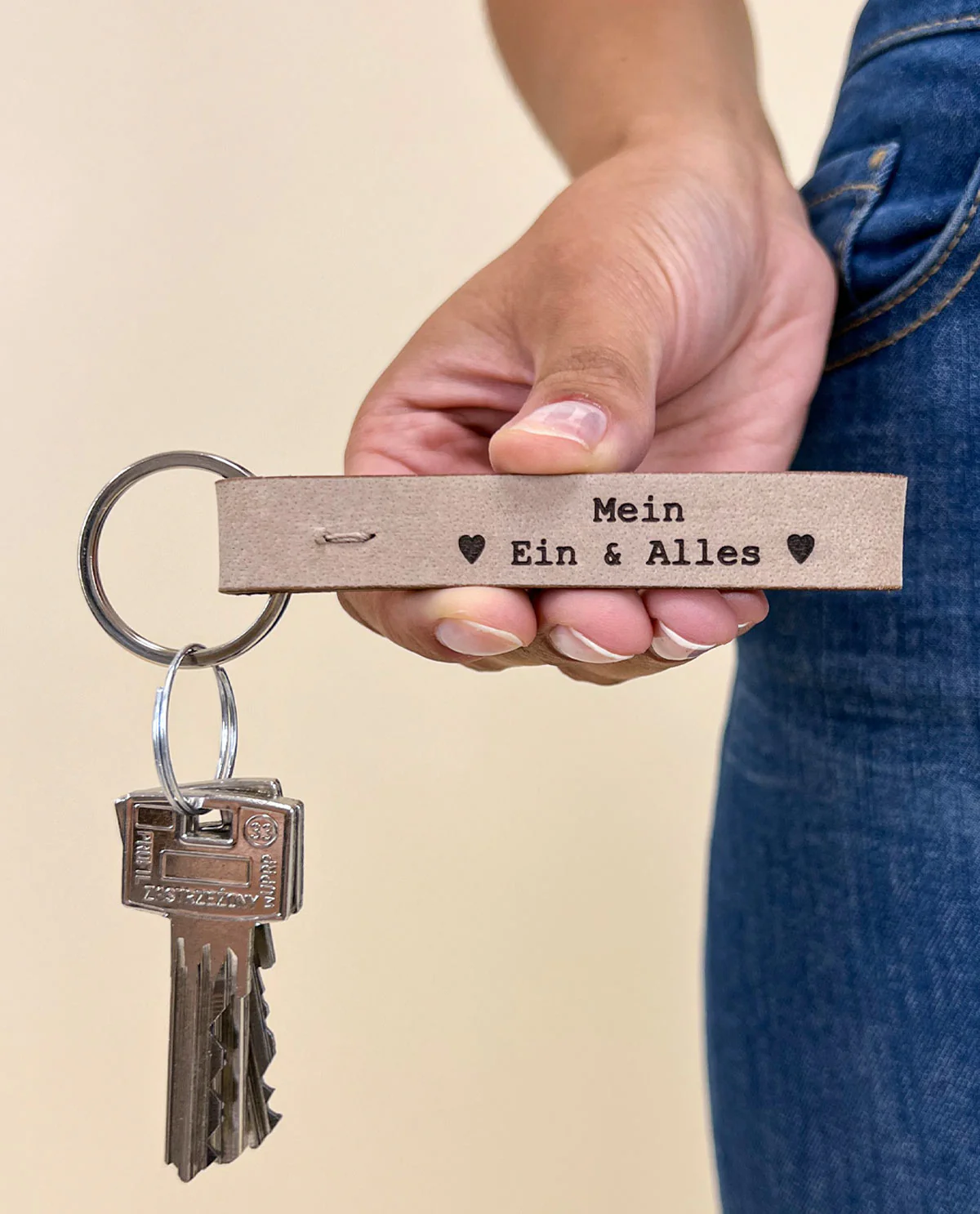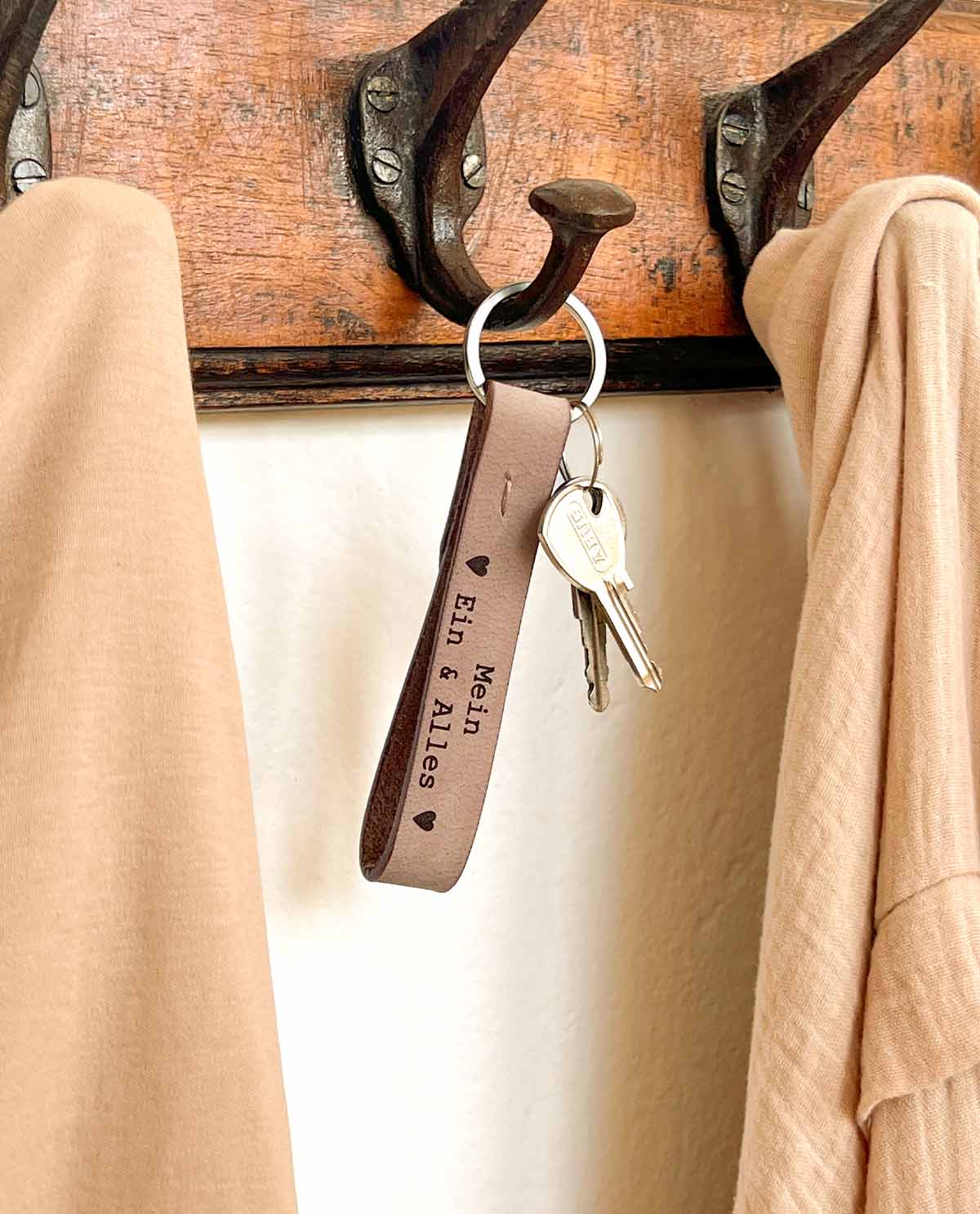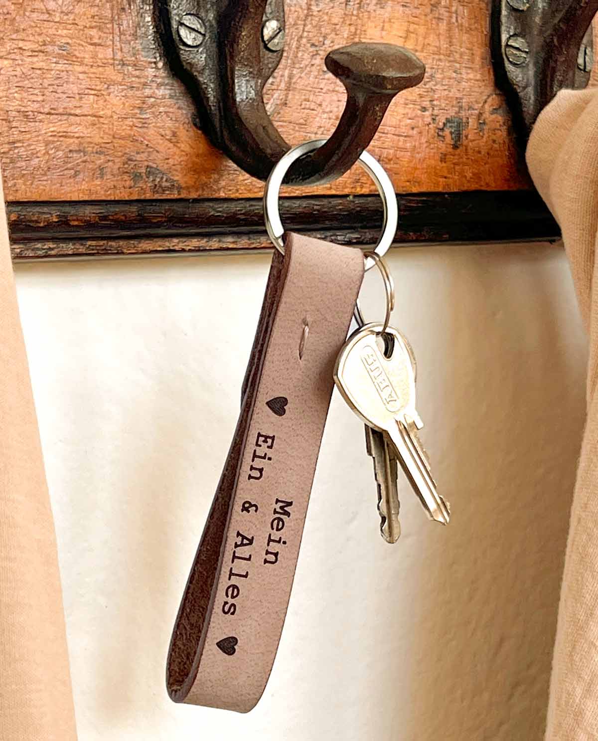 Unser Schlüsselanhänger “Aaron” ist das ideale Geschenk für Deine Lieblingsmenschen. Gefertigt aus 100% echtem Büffelleder ist der Schlüsselanhänger nicht nur sehr stabil und zugleich weich, sondern erstrahlt auch im angesagten Vintage-Look. Ob für Wohnungs-, Garten- oder Arbeitsschlüssel – mit “Aaron” machen alle Schlüssel eine gute Figur und sind im Handumdrehen in Deiner Handtasche oder Deinem Rucksack griffbereit. Durch die Gravur erhält Dein Freund oder Deine Freundin nicht nur ein praktisches, sondern auch ein ganz persönliches Geschenk.