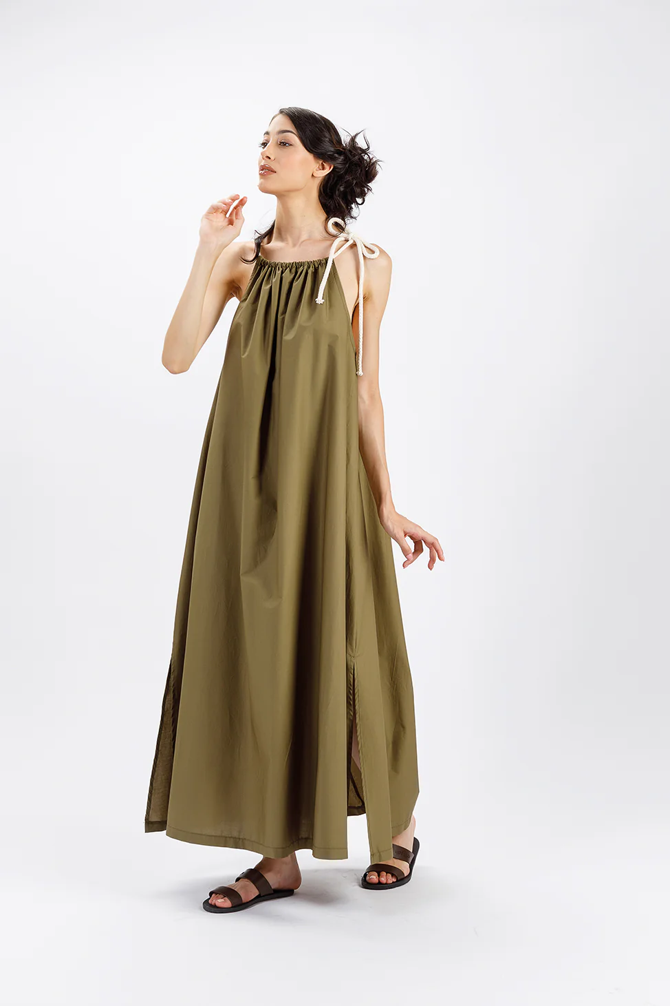 ABITO LUNGO IN PURO COTONE. LINEA AMPIA CON SPACCHI LATERALI, SCOLLO ALLโ€™AMERICANA ARRICCIATO SU CORDINO CHE SI CHIUDE CON UN ROMANTICO FIOCCO SULLA SPALLA.