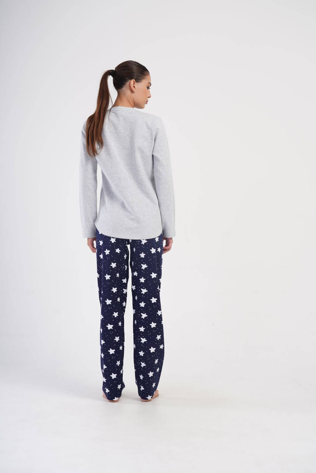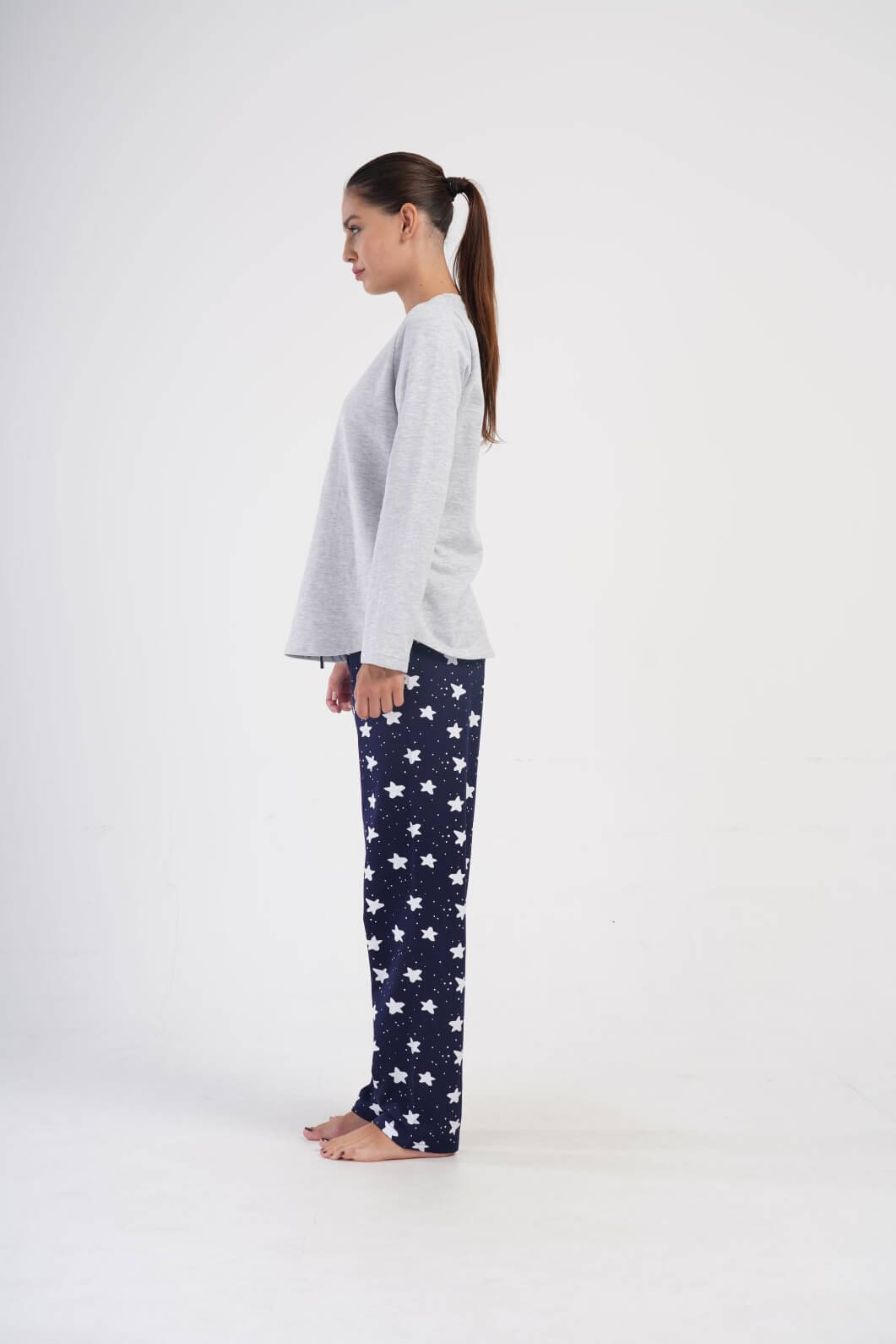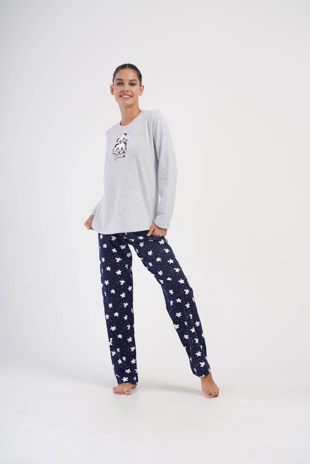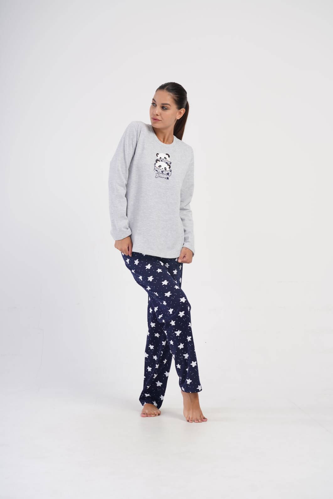 Pigiama donna in cotone ocieplato: maglia grigia con panda e pantaloni blu a stelle. Caldo, comodo e adorabile. Firmato Vienetta, made in Europe.