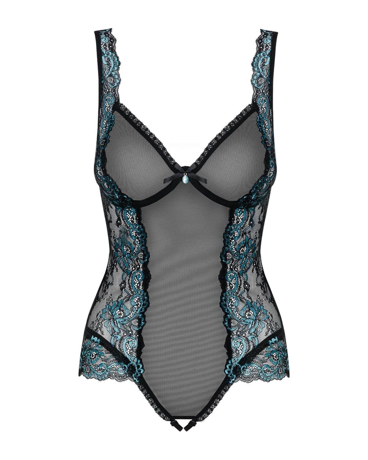 Piccante body intimo con ferretto, ciondolino turchese tra le coppe, aperto all’inguine. Disponibile anche nella taglia XXL.