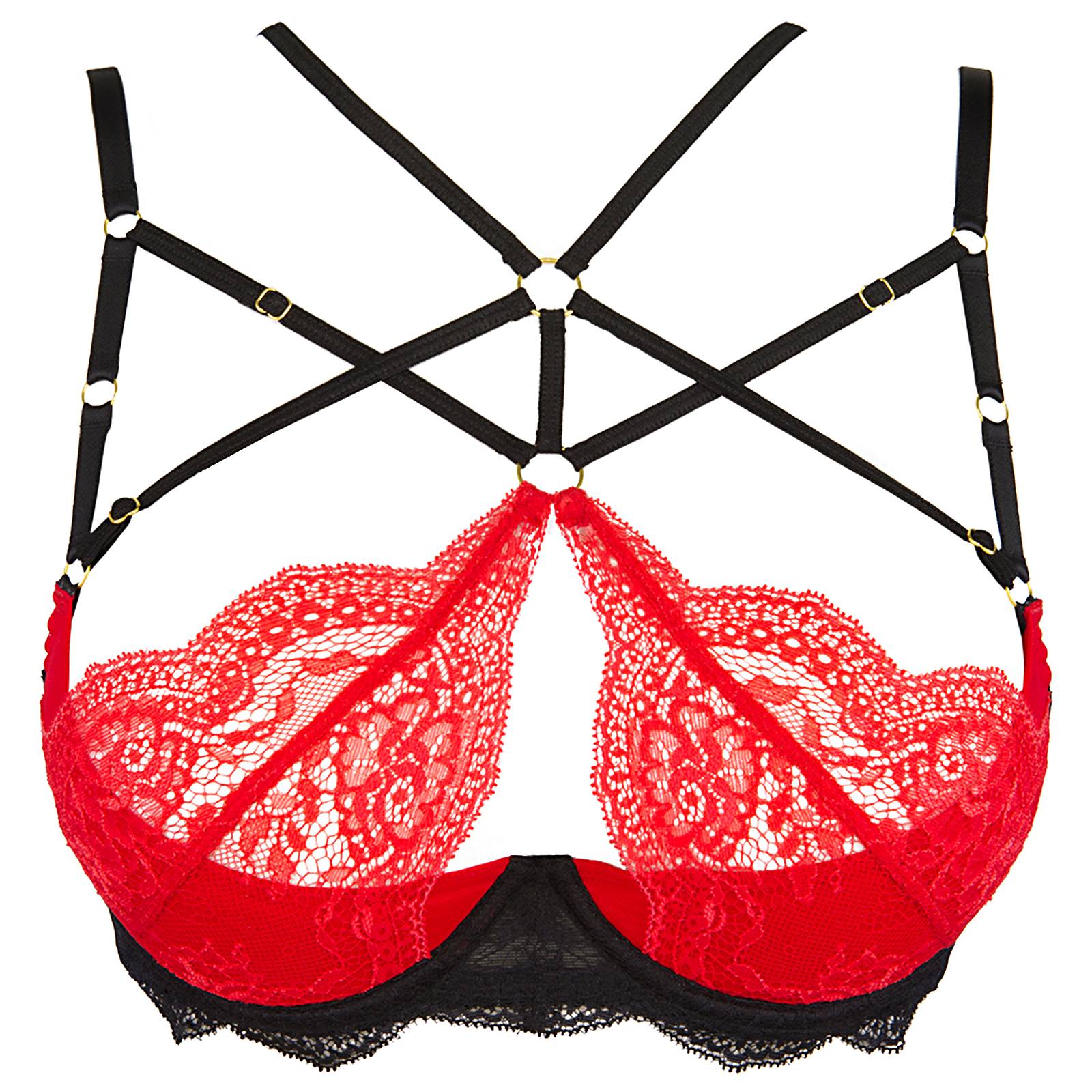 Sexy reggiseno in pizzo nero e rosso con incroci.
