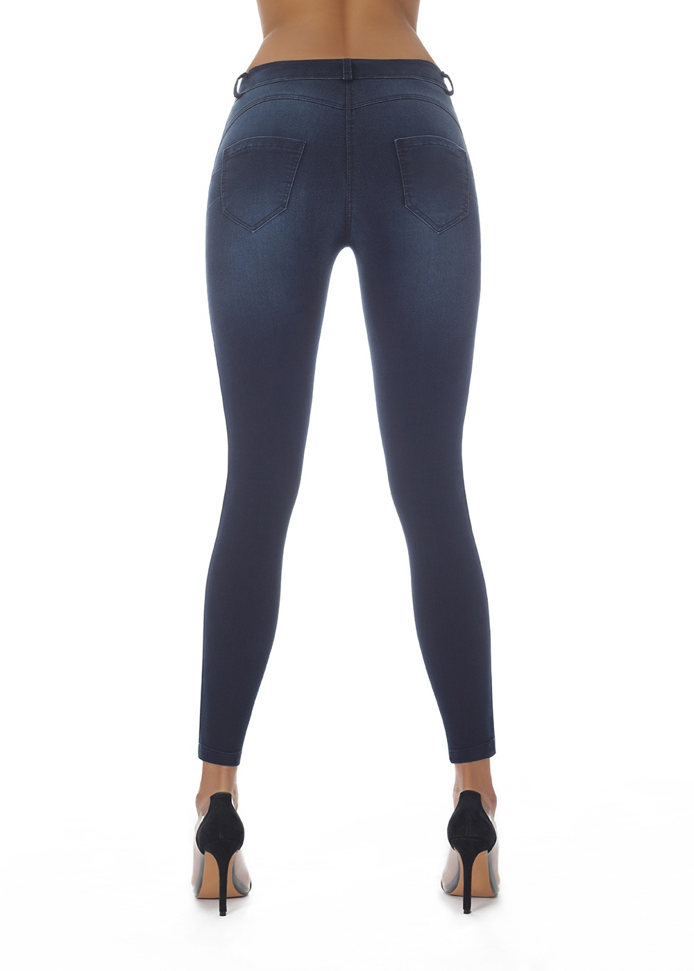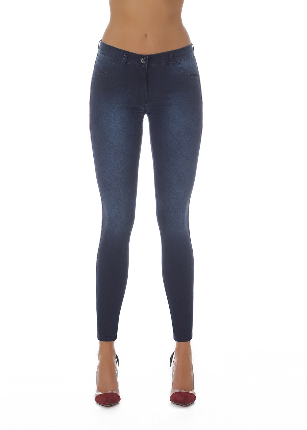 Jeans coprenti, flessibili e modellanti dotati di tasche anteriori e posteriori con chiusura a bottone e cerniera zip. Decorati lateralmente da strisce rosse.