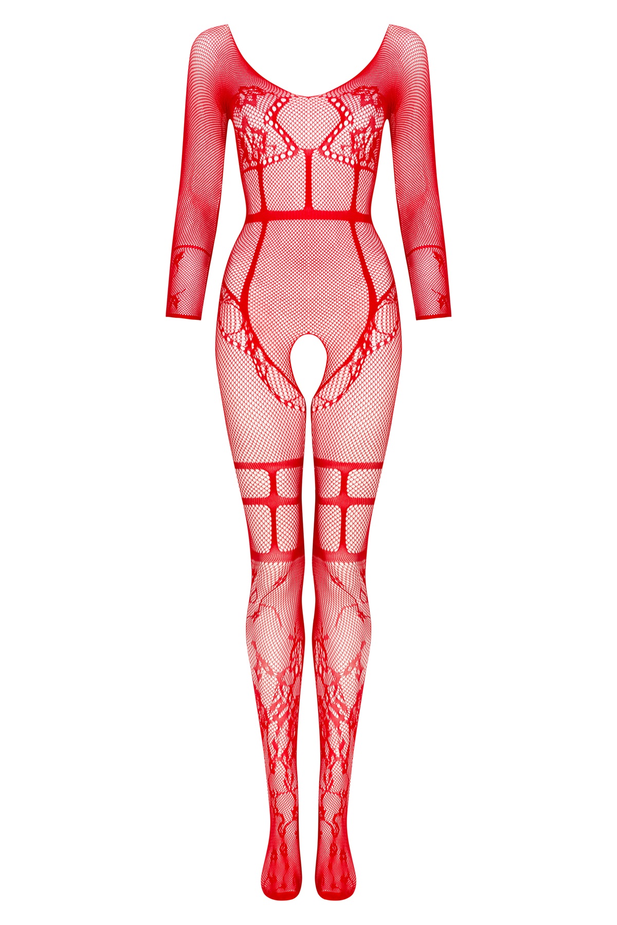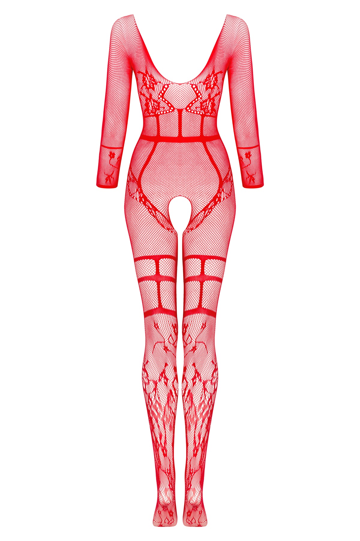 Sensuale bodystocking aperta in microrete rossa decorata con manica a tre quarti e scollo profondo sul busto e sulla schiena.