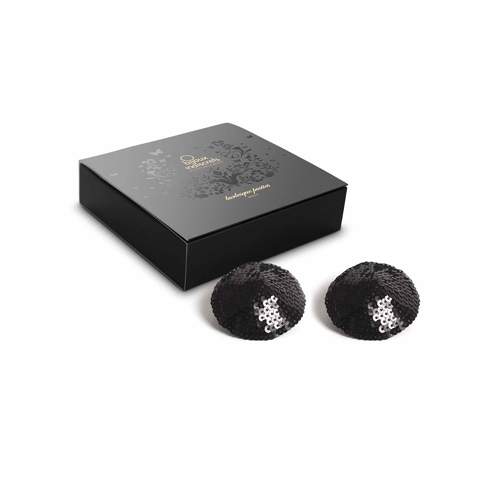 Sensuali copricapezzoli adesivi in stile burlesque tempestati di paillettes. Il prodotto è confezionato in elegantissima confezione regalo.