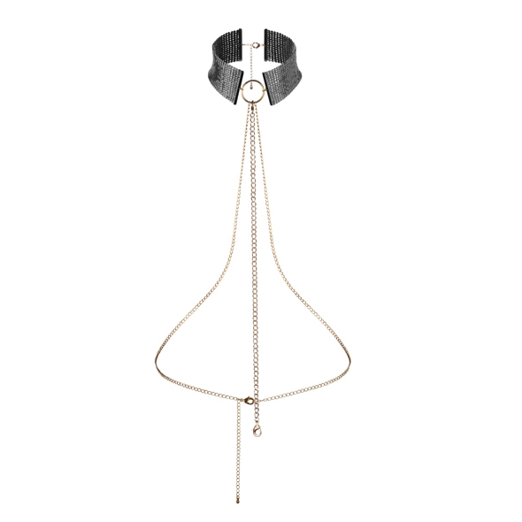 Elegante decorazione per il corpo composta da un collarino in rete metallica a cui è attaccata la catenina (regolabile) in metallo che scende lungo il busto e la vita. Disponibile nei colori: oro, argento e nero. Il prodotto è confezionato in elegantissima confezione regalo.