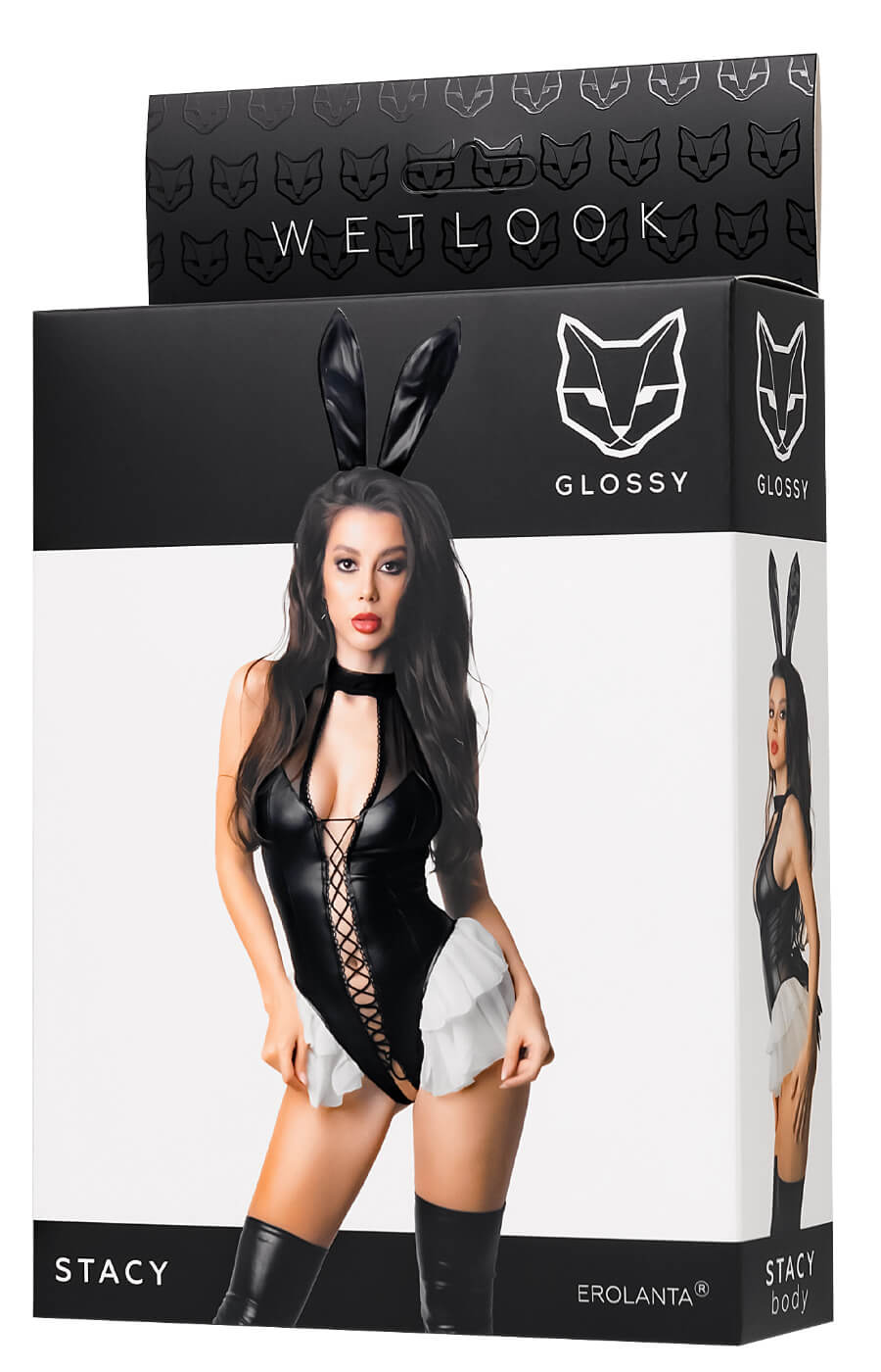 Rendi unico il tuo look con il body da coniglietta Stacy di Glossy. Questo capo in simil-pelle nera è arricchito da balze bianche, una morbida coda da coniglio e dettagli provocanti come la scollatura sexy con choker integrato. L’allacciatura frontale e l’apertura cut-out sulla schiena completano un design che non passa inosservato.
