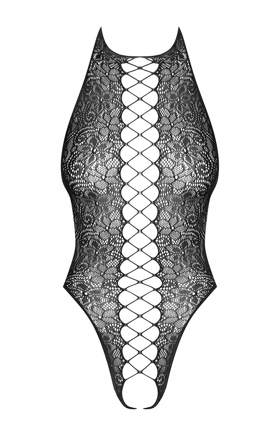 Body in maglia nera con motivo floreale, schiena scoperta e apertura sul cavallo. L’allacciatura sul davanti crea un effetto audace e sensuale.