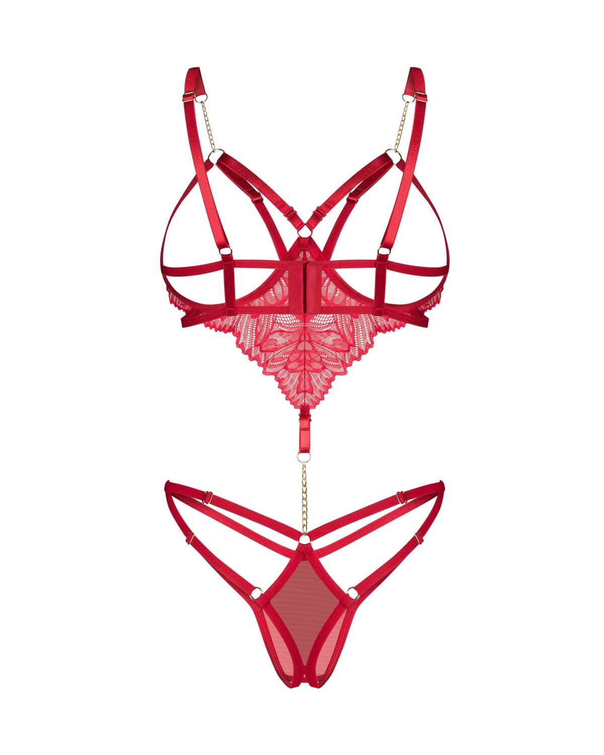 Body rosso in pizzo con coppe aperte e catena oro sul davanti. Design audace con aperture intime e dettagli regolabili.