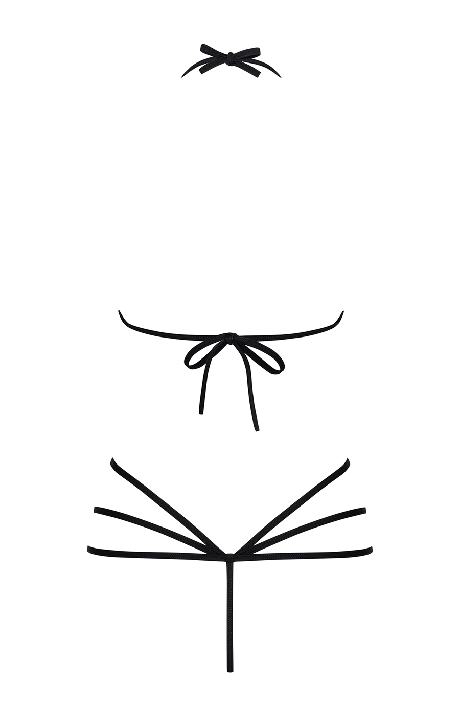 Body Slave nero in strisce elastiche con cavallo aperto e lacciatura sul collo e sulla schiena. Sensualità pura e libertà di movimento.