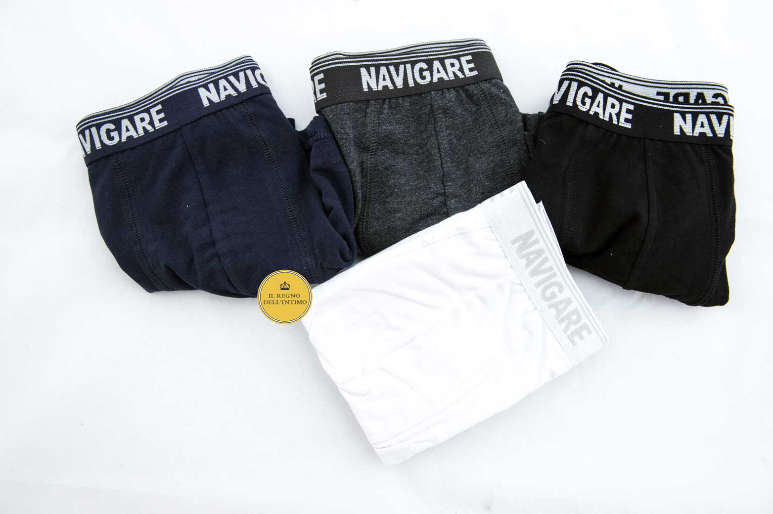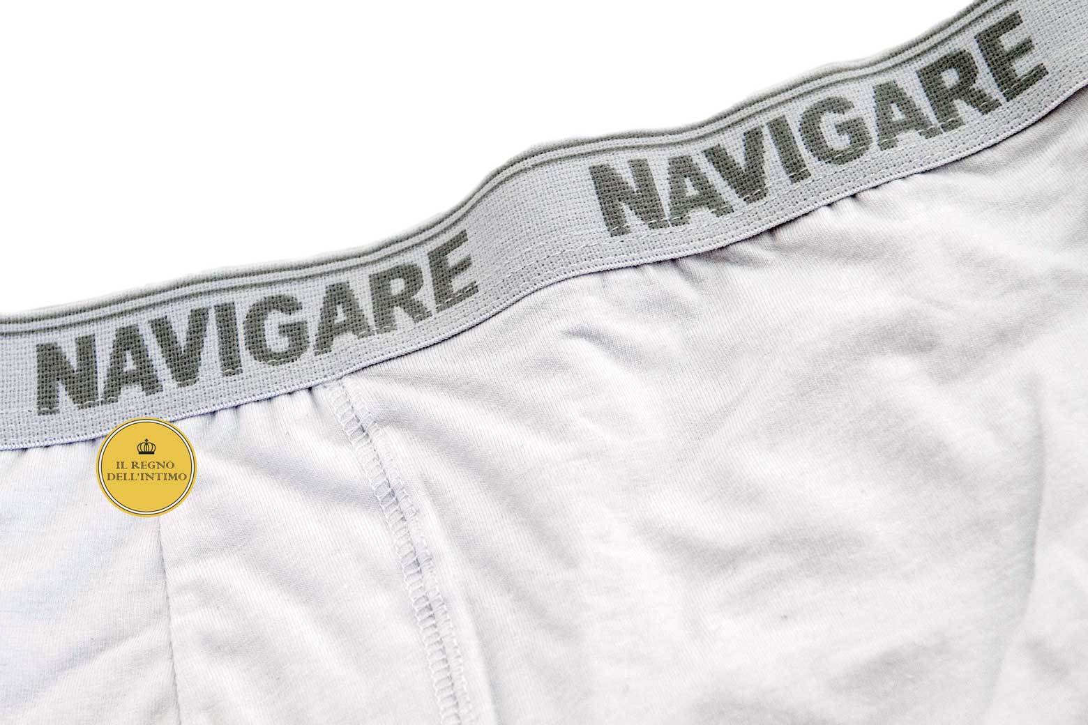 Boxer Navigare uomo realizzato in morbido cotone bielastico con elastico esterno logato. Dei colori grigio e blu il massimo acquistabile è di pezzi.5 per colore. Disponibile in quattro colori: Nero Bianco Grigio Blu