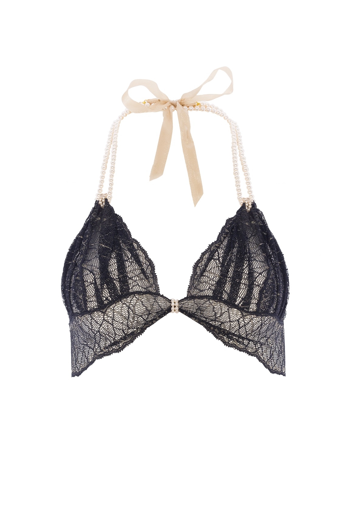 Reggiseno in pizzo italiano nero e lurex con doppia collana di perle.