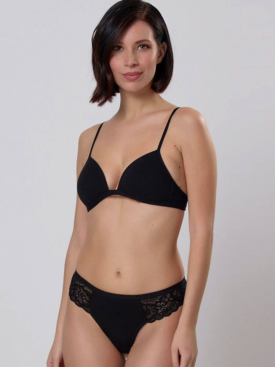 La brasiliana Jadea 516 unisce morbidezza e stile in una linea essenziale e femminile. Il tessuto in cotone modal elasticizzato si adatta dolcemente alle forme, mentre il pizzo floreale sui fianchi aggiunge un tocco raffinato.