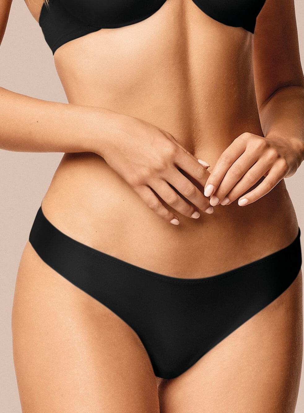 Brasiliana mini in microfibra riciclata lucida. Invisibile sotto gli abiti, confortevole e leggera. Disponibile in nero e sabbia.