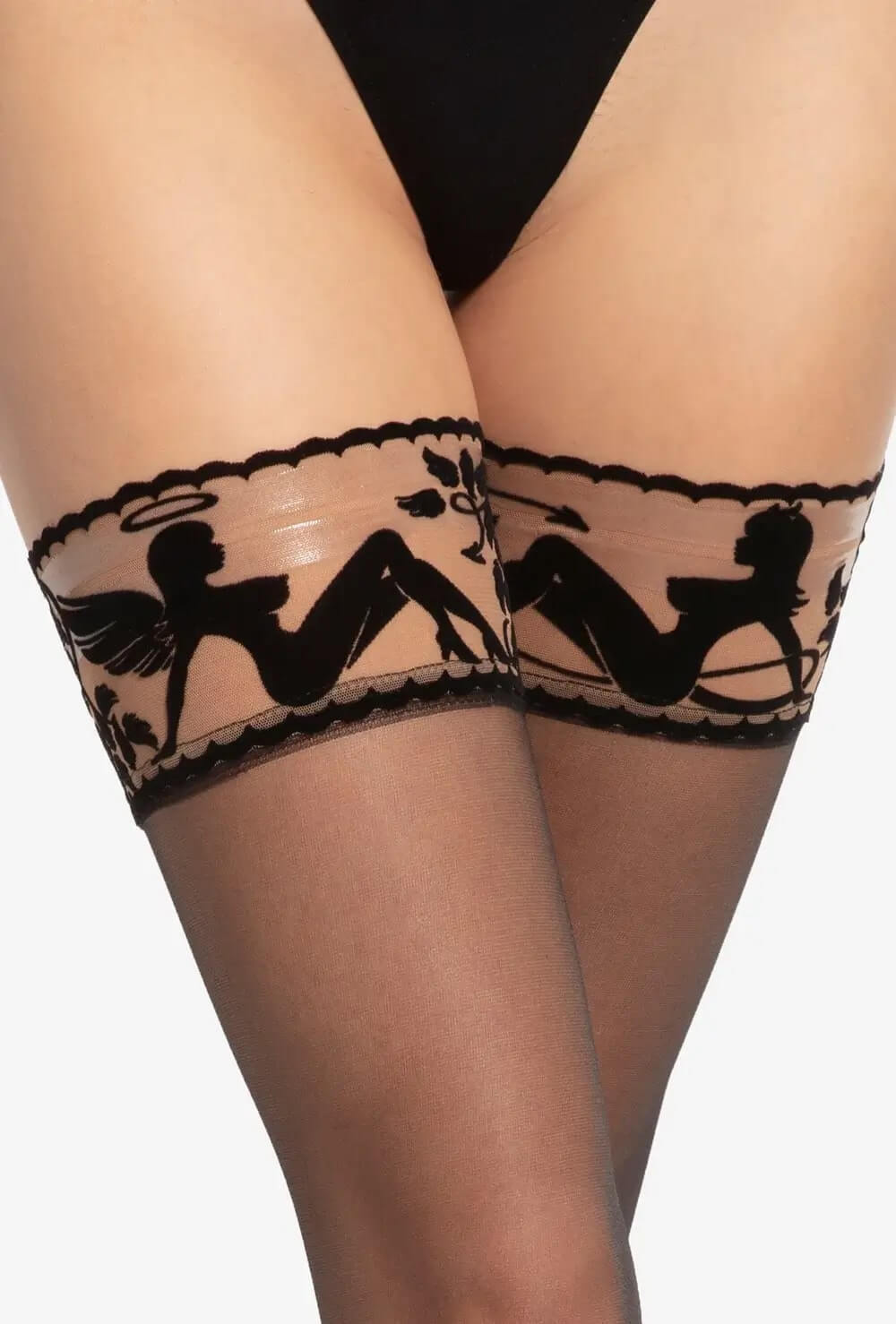 Calze autoreggenti trasparenti con fascia decorativa in velluto floccato e motivo sensuale Angelia vs Devilia. Perfette per serate speciali.