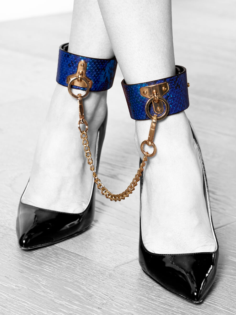 Leg cuffs blu con finitura iridescente e catena dorata, regolabili e raffinate, per giochi di ruolo e scenari audaci dal gusto fashion.
