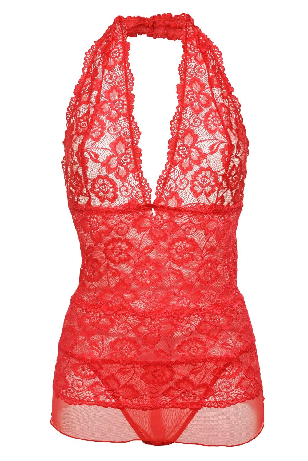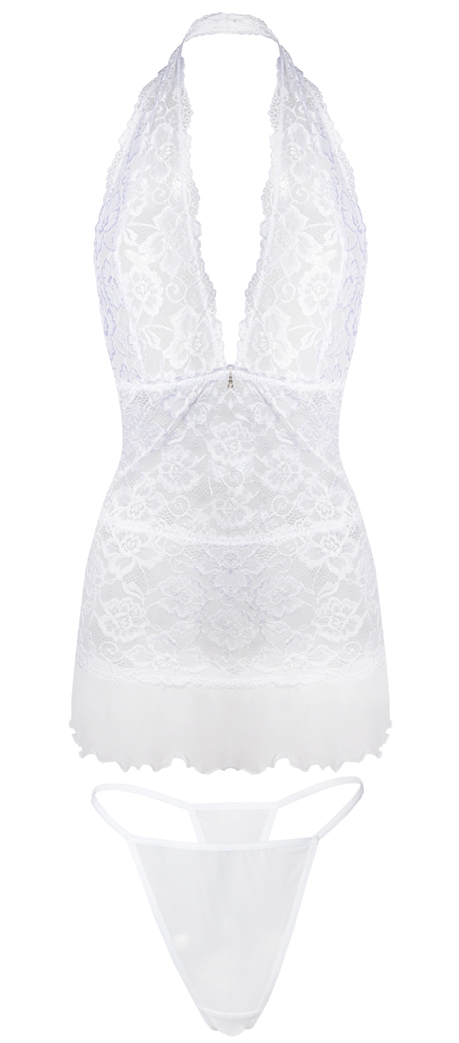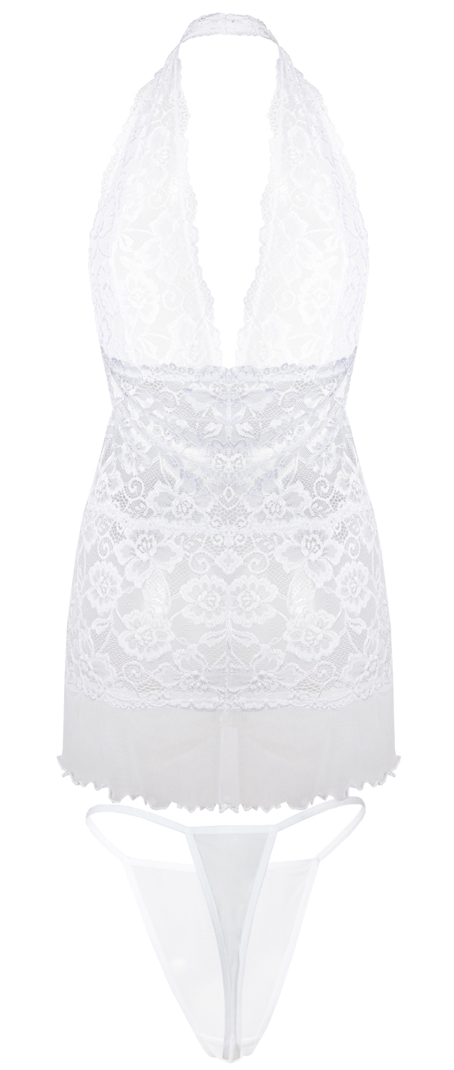 Chemise in elegante pizzo floreale con orlo inferiore in tulle trasparente. Scollatura profonda e sexy e allacciatura al collo. Perizoma coordinato incluso.