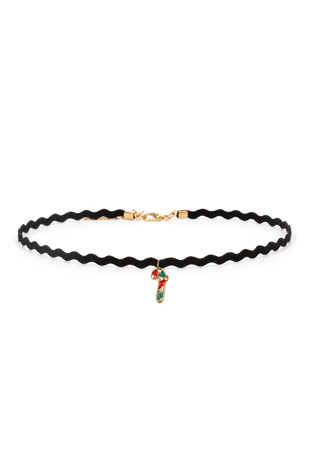 Grazioso choker girocollo realizzato in tessuto nero dalla forma ondulata, decorato da un pendente natalizio.