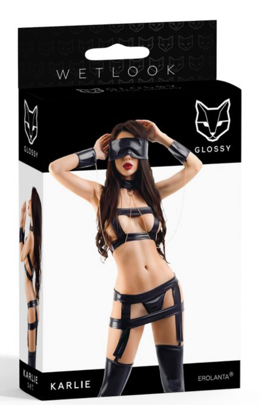 Il completo Karlie in tessuto wetlook di Glossy è pensato per chi ama osare. Questo set include una mascherina effetto bagnato, un collarino collegato con catene ai polsini e un top a fasce stile harness che avvolge il busto in modo seducente. Il reggicalze coordinato con fasce larghe e 4 ganci aggiunge un tocco sensuale, mentre il perizoma abbinato completa il look. Un set irresistibile per un look audace e provocante. Calze escluse.