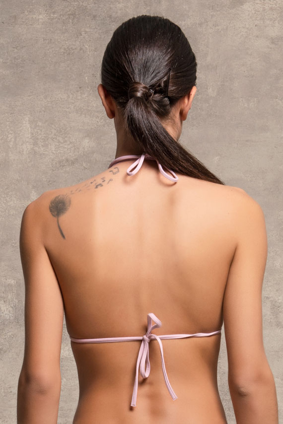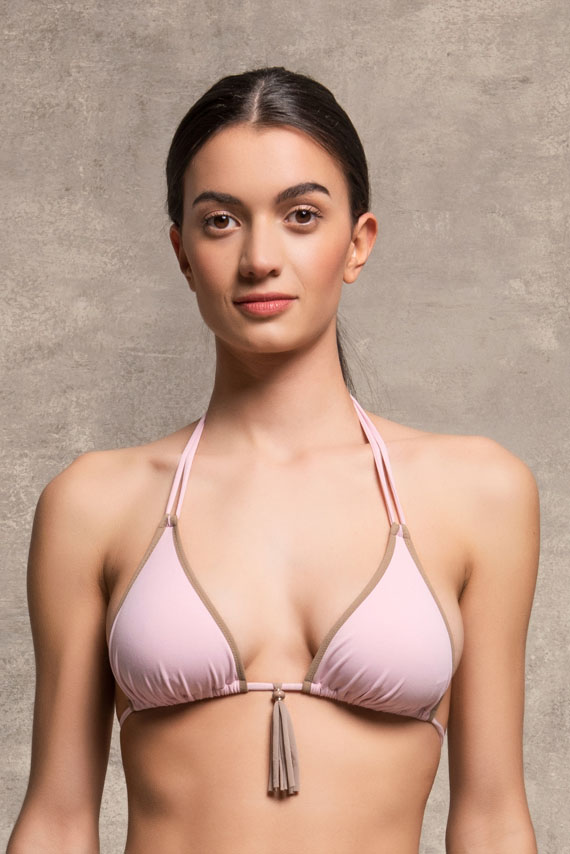 Reggiseno mare a triangolo in morbida Lycra super opaca caratterizzato da finitura color cocco e accessorio nappina removibile.