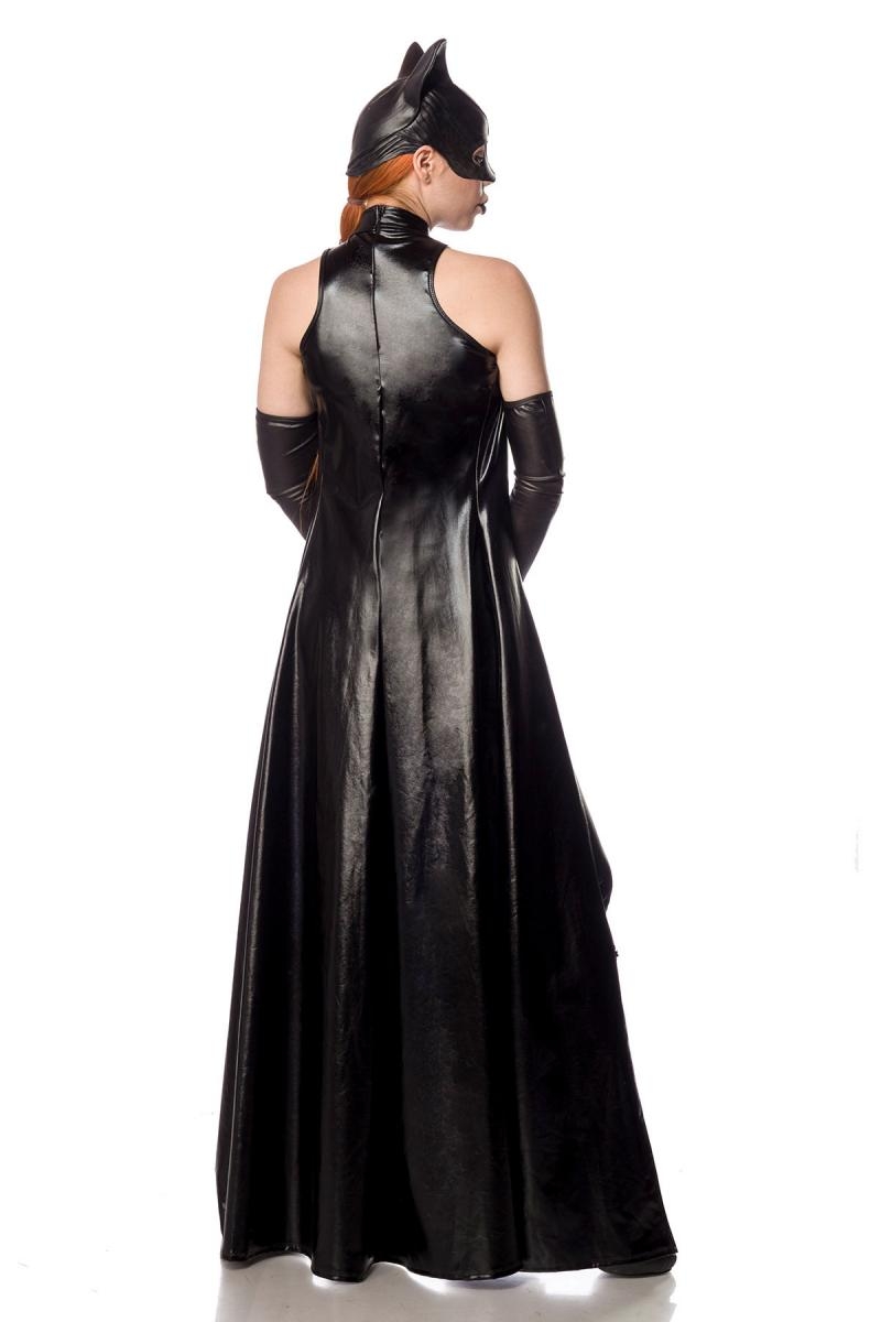 Meraviglioso costume da Bat Girl realizzato in tessuto wetlook elasticizzato dall'effetto lucido, che include: -Il corpetto senza spalline dotatto di comoda chiusura a ganci sul davanti. -La lunga mantella con spalline e dettaglio sul collo. -I leggings abbinati. -I guanti lunghi oltre il gomito coordinati. -La mascherina con orecchie da pipistrello.