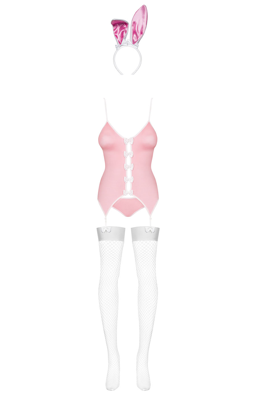 Coniglietta maliziosa firmata Obsessive: top con giarrettiere, fiocchi, orecchie e coda. Un look audace per notti giocose e piene di sorprese.