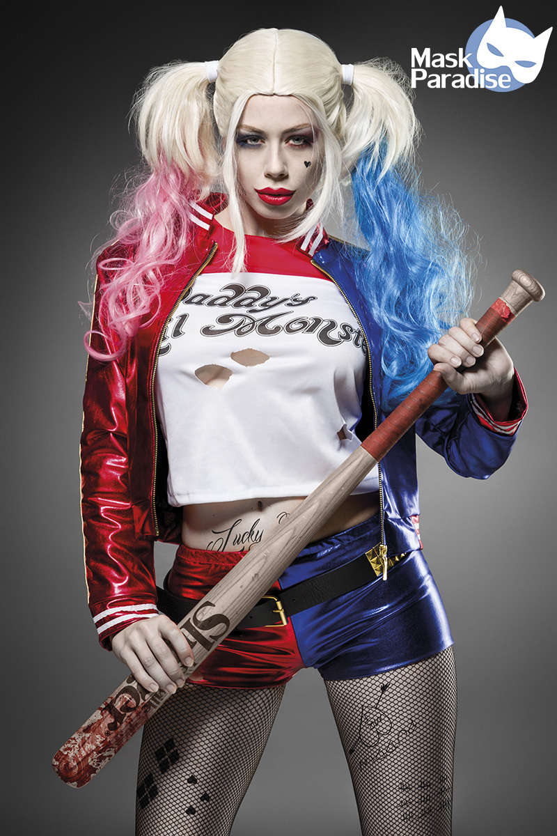 Costume da Harley Quinn dal film "Suicide Squad", e fidanzata di Joker, ricco di dettagli e decorazioni identiche ai reali abiti presenti nel film. Il costume è completo di: -Giacca bicolore blu e rosso, con cerniera, decorata da finissimi dettagli dorati sulle maniche e sulla schiena. -Maglietta bianca e rossa decorata da scritte uguali a quelle presenti nell’abbigliamento del film. -Pantaloncini bicolore blu e rossi. -Cintura con dettagli dorati. -Collant decorati da stampe nere, di scritte e disegni, e da strass.