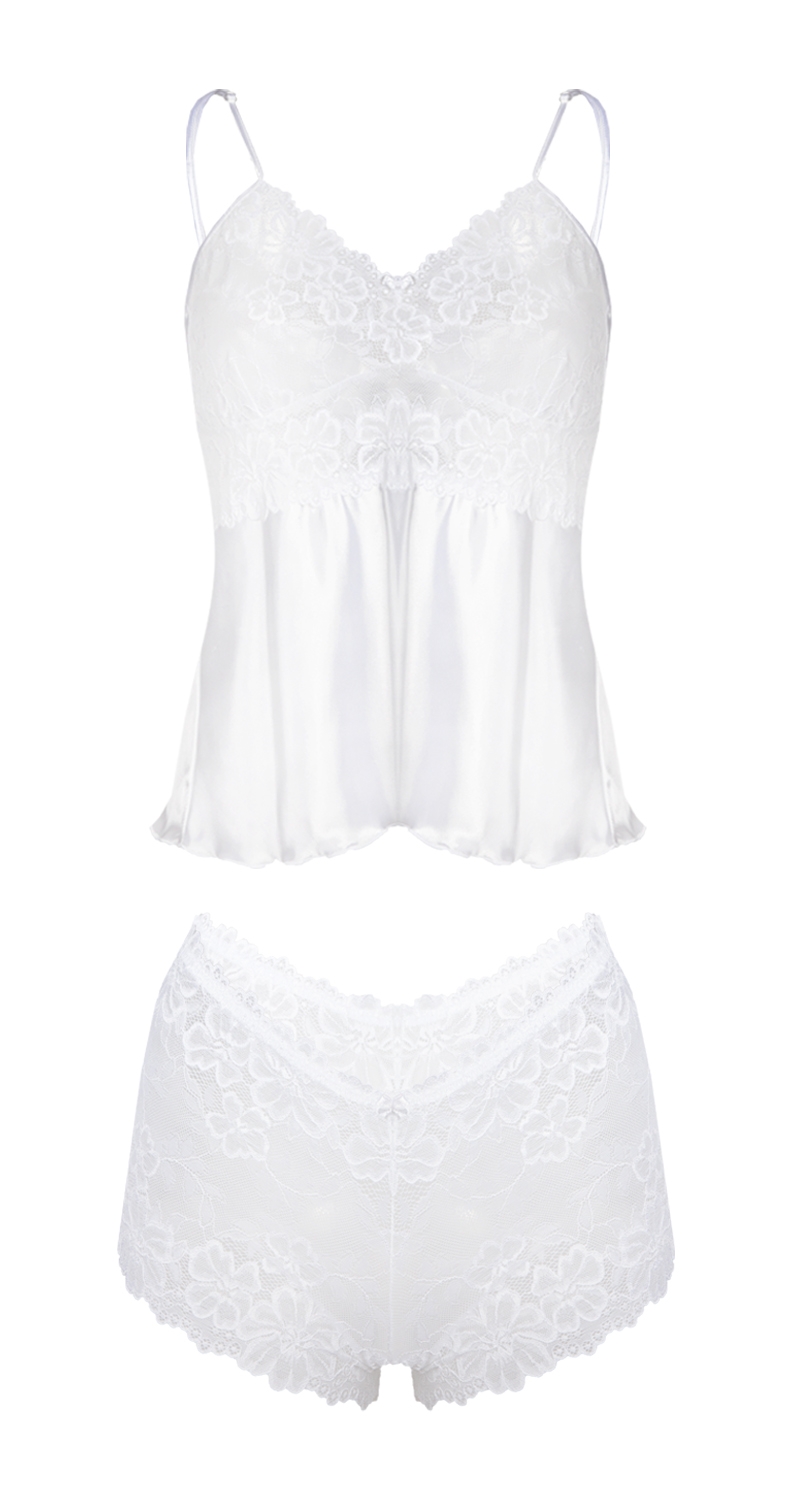 Un set chic e speciale tutto per te, che consiste in un elegante top in raso e pizzo con sottili spalline regolabili, e culotte in pizzo.