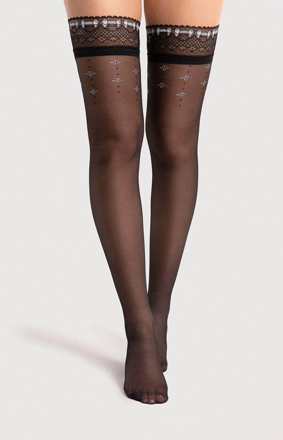 Calze autoreggenti 20 denari in nero con dettagli decorativi bianchi a constrasto e balza in fine pizzo.