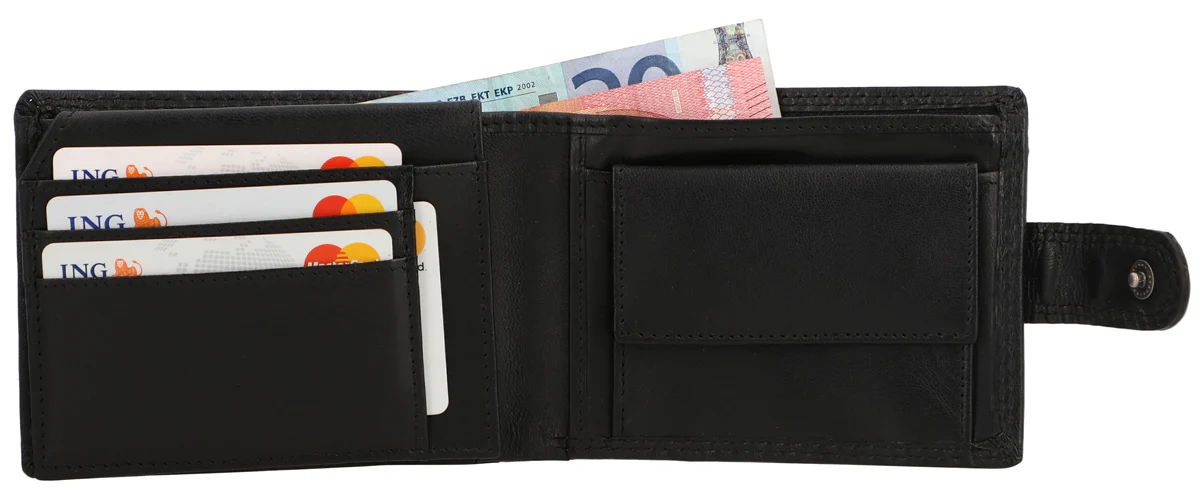 All’interno ti offre il massimo comfort in funzionalità . Il sistema di organizzazione intelligente ti aiuta ad avere rapidamente e facilmente a portata di mano le tue carte più importanti, documenti, monete e banconote. Dove a prima vista non sembra esserci molto spazio, ce n’è più di quanto pensi. Tecniche di piegatura e scomparti ti permettono di sistemare tutto ciò che immagini. Una finestra di visualizzazione con dimensioni di 10,5 x 6,5 cm ti consente, ad esempio, di mostrare il tuo abbonamento mensile senza doverlo estrarre. La pelle di bufalo è lavorata di alta qualità ed estremamente robusta. Ti offre una grande stabilità della forma e promette che ti godrai a lungo questo fantastico prodotto. Un bottone a pressione collegato a una linguetta chiude il portafoglio in modo semplice e senza complicazioni.