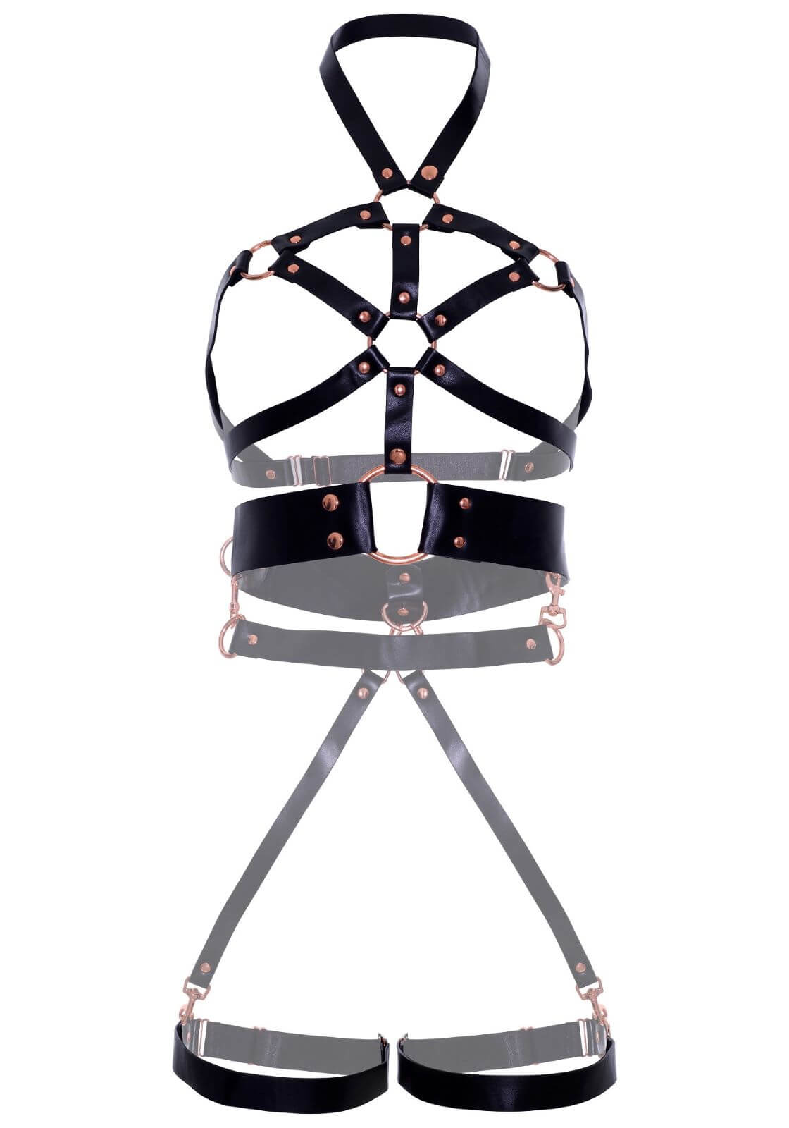 Sensuale body harness nero con inserti in metallo, aperto sulle coppe, con giarrettiere integrate nel design.