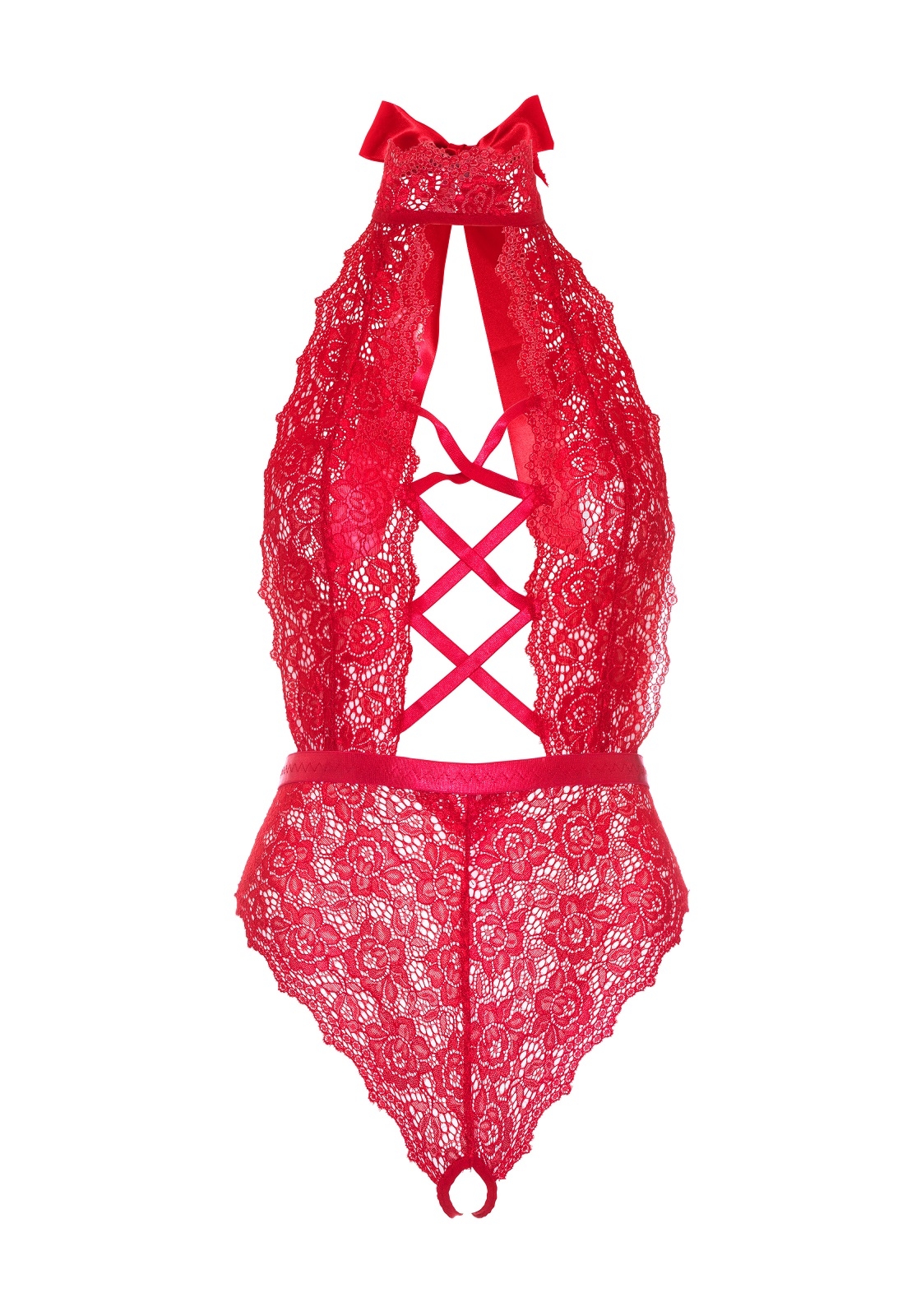 Body aperto all'inguine, senza spalline con allacciatura al collo e schiena nuda, realizzato interamente in pizzo rosso dal motivo floreale, decorato da una sensuale scollatura a stringhe sul décolleté.