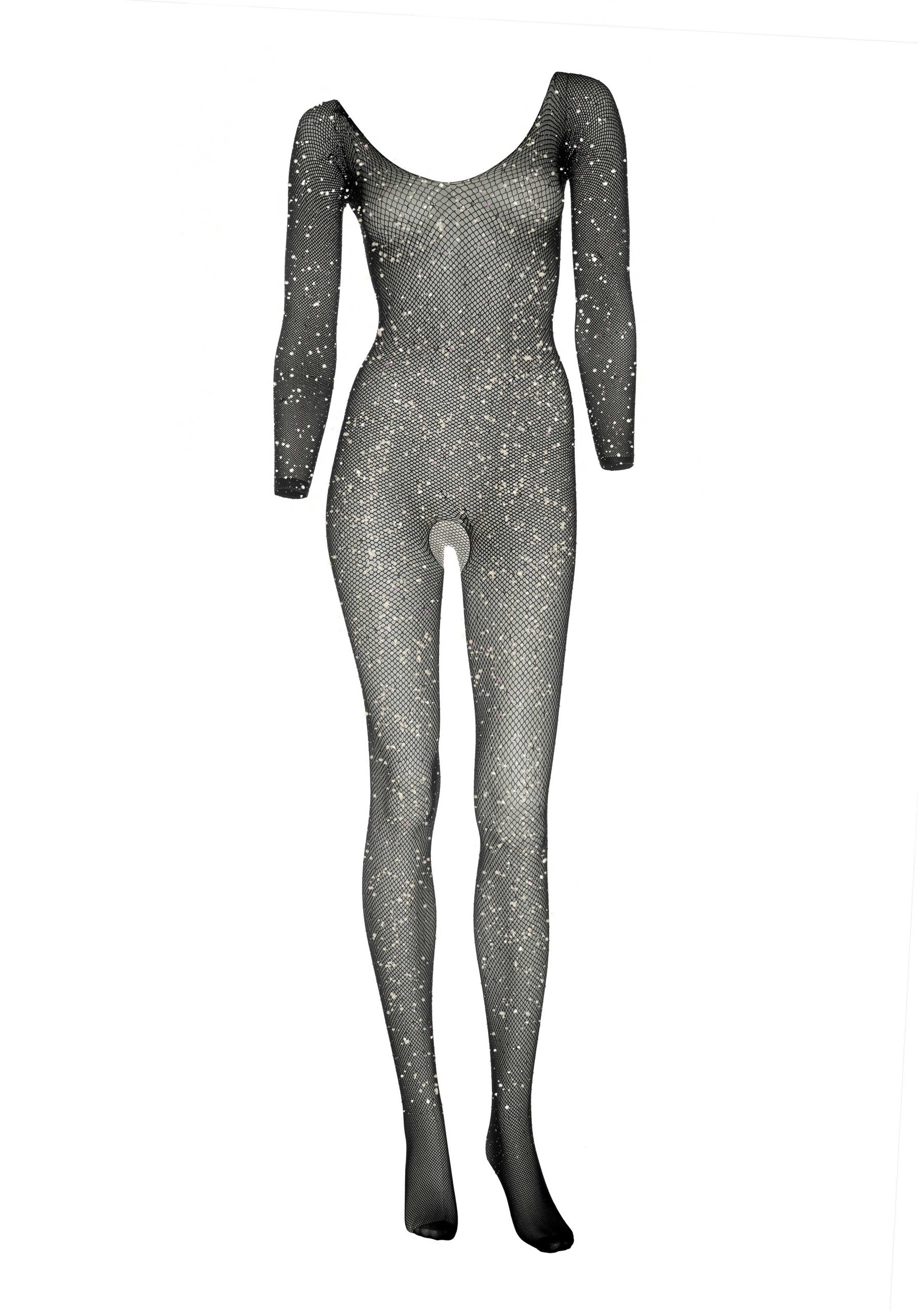 Sensuale tutina aperta all’inguine, con maniche a tre quarti realizzata in morbida micro rete decorata da lurex cristallizzato.