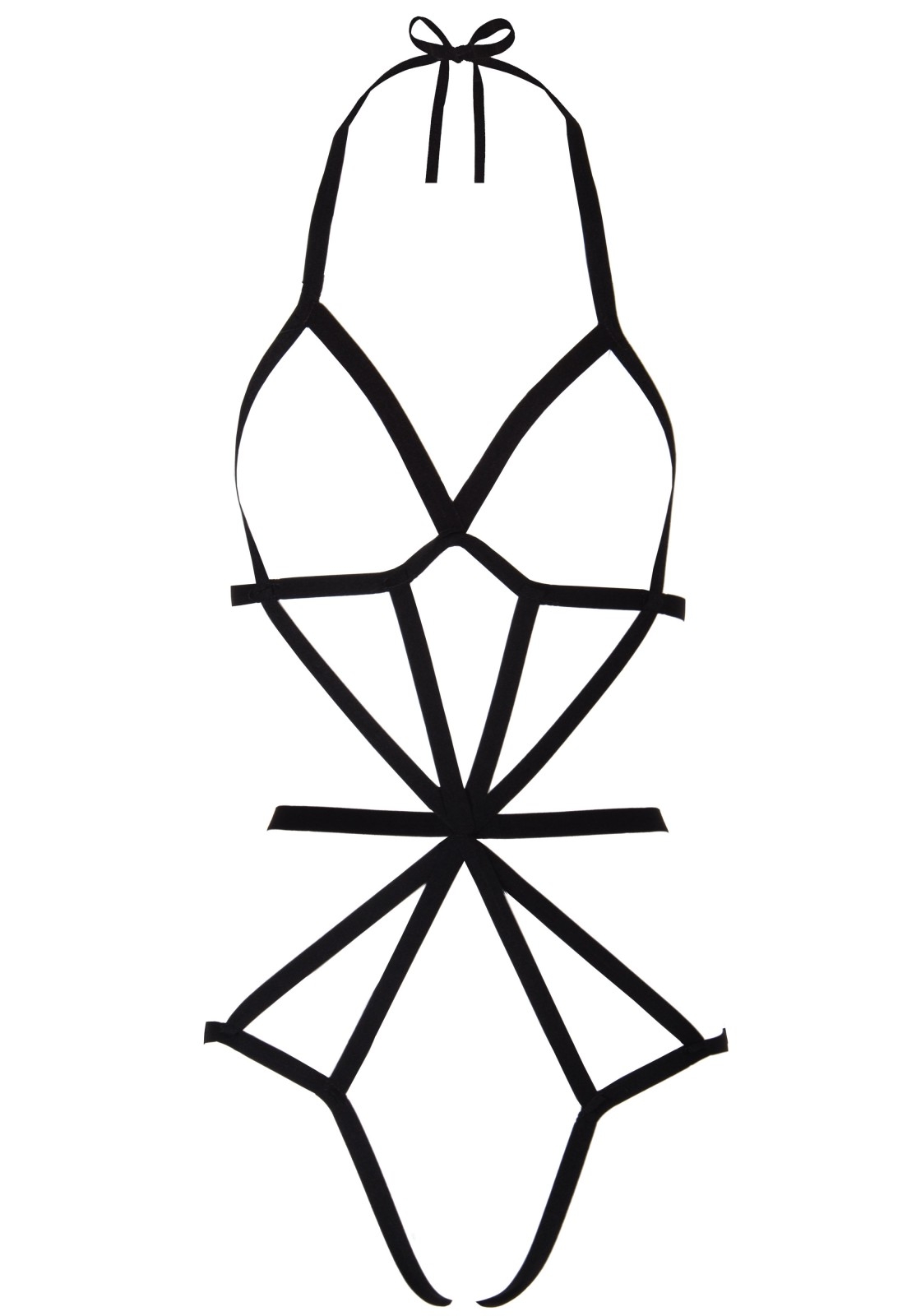 -Il body imbracatura coordinato realizzato in morbido tessuto nero con allacciatura dietro il collo.