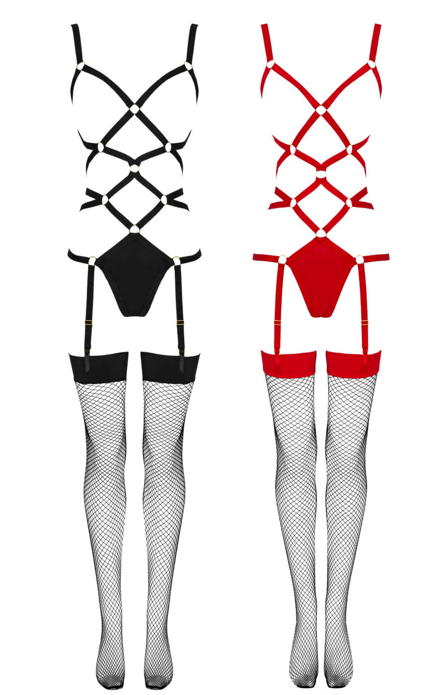 Body aperto effetto harness in nero o rosso, con reggicalze integrato e calze a rete incluse. Disponibile nel nostro negozio a Torino.
