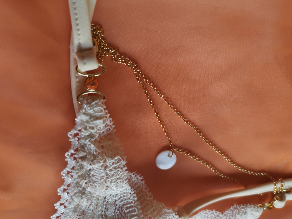 Perizoma elegante a V, in pizzo ricamato avorio, con catenine color oro e gioielli.