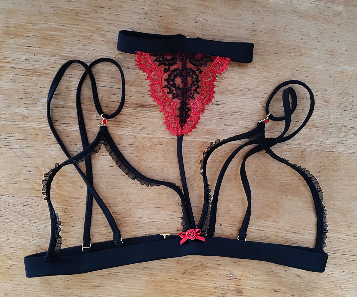 Reggiseno tutto aperto con tulle ricamato in rosso e nero.