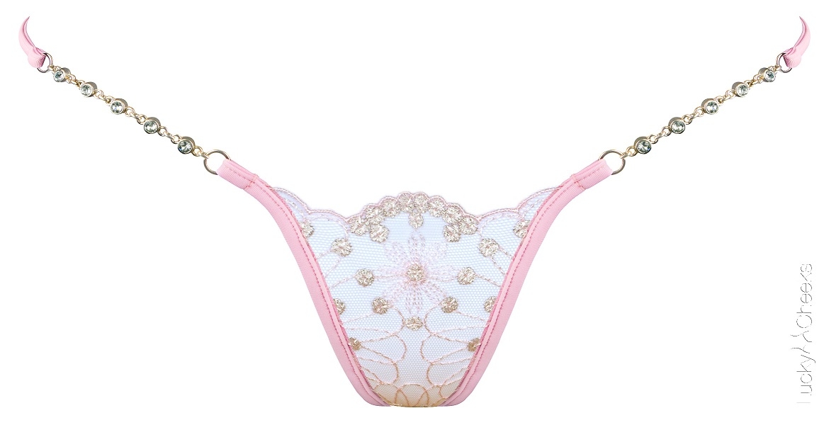 Mini perizoma in pizzo e tulle rosa con ricami e inserti gioiello.