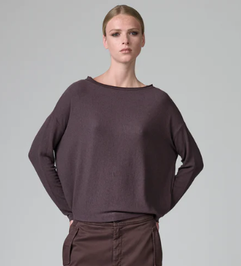 Shirt in costina di jersey modal kashmir, tinto in capo. Vestibilitร over, linea dritta, spalla scesa. Scollo sbarcato rifinito da ricciolino in maglia. Corpo con verso costina in orizzontale, manica in verticale e fondi con taglio a vivo. Davanti piรน corto del dietro che crea motivo di scalino sul fianco. Dietro aperto da otto bottoni su lista rifinita con ricciolino a vivo.