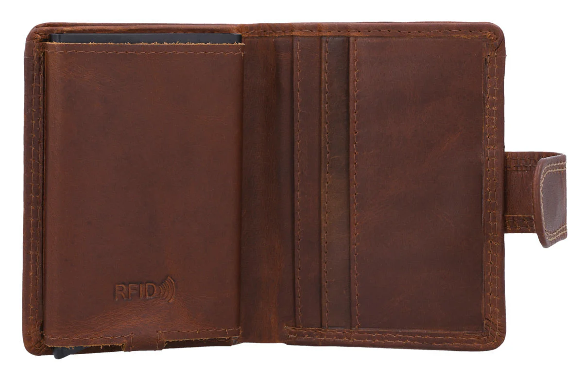 Con il meccanismo a estrazione innovativo, hai le tue carte sempre a portata di mano – semplicemente premendo un pulsante. Inoltre, la tecnologia di protezione RFID integrata protegge i dati sensibili da letture indesiderate, permettendoti di viaggiare senza preoccupazioni. La disposizione interna ben studiata garantisce ordine e chiarezza. Che sia per la vita quotidiana o per i viaggi – il “Matheo” è il tuo compagno affidabile dal design elegante.