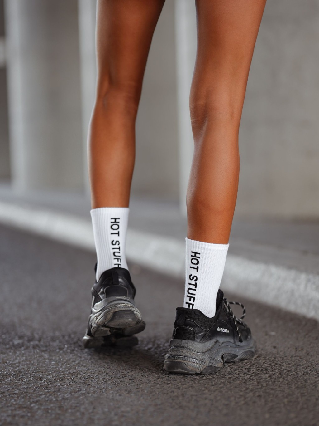 Calzini in cotone con scritta "Hot Stuff", disponibili in nero e bianco.