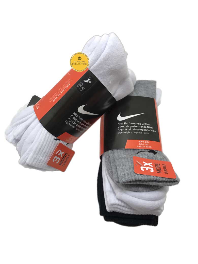3 Calze in spugna Nike uomo/donna con pianta e tallone rinforzati, altezza polpaccio. Bordi a costine per una vestibilità aderente e confortevole. Pacco assortito o Bianco.
