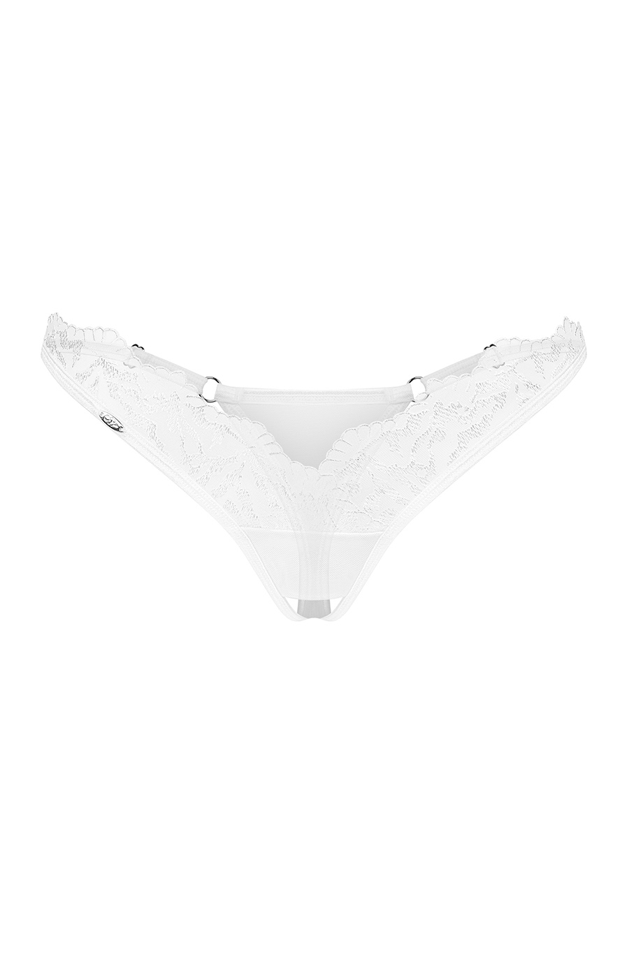 Perizoma bianco aperto con pizzo, stringhe regolabili e dettaglio silver nickel-free.