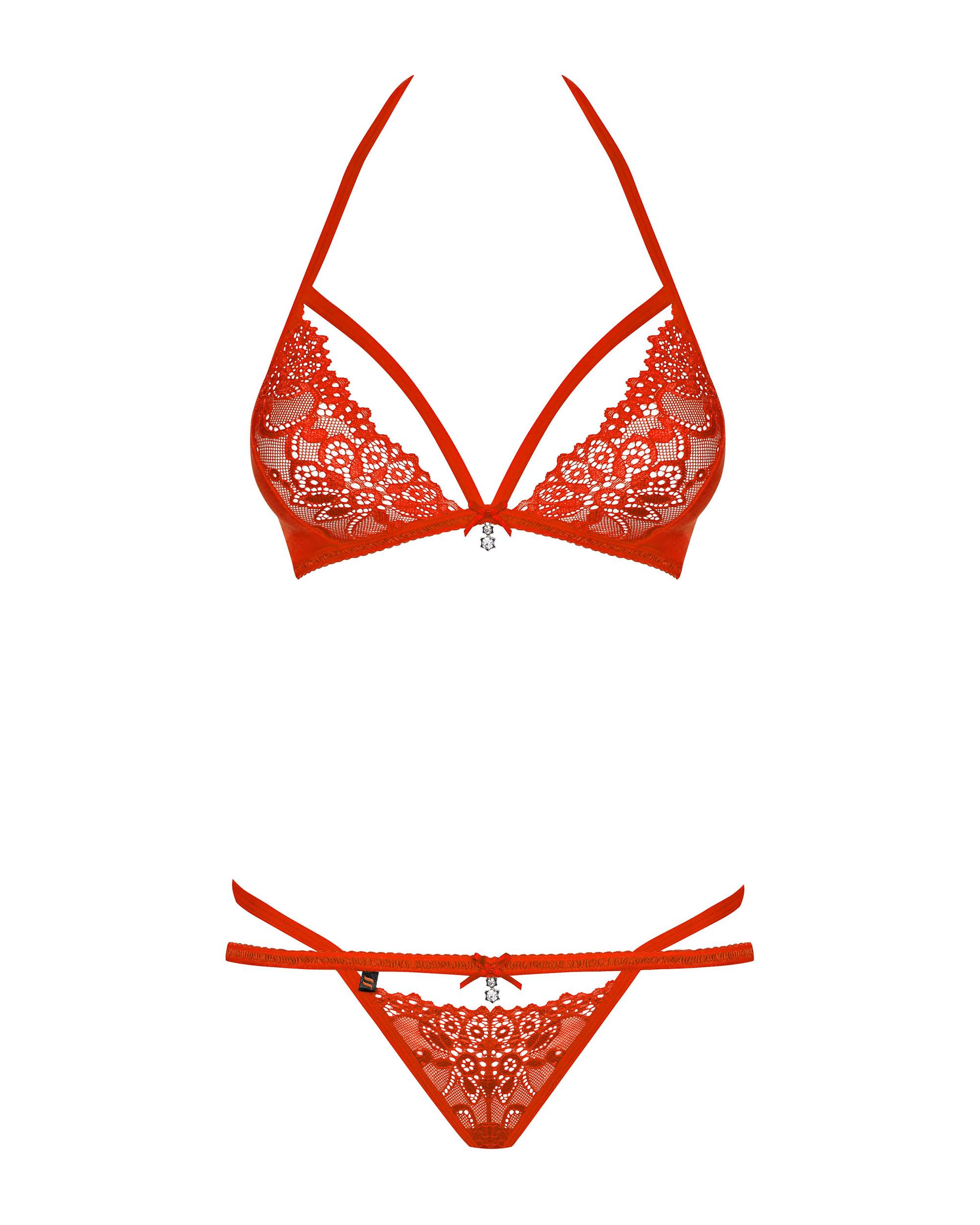 Grazioso completino intimo due pezzi realizzato interamente in morbido pizzo rosso dal motivo floreale, che include: -Il reggiseno con doppia allacciatura dietro il collo e dietro la schiena, con spalline regolabili e decorato da un gioiello posto tra le coppe. -Il perizoma a doppia stringa decorato anteriormente da un gioiello.