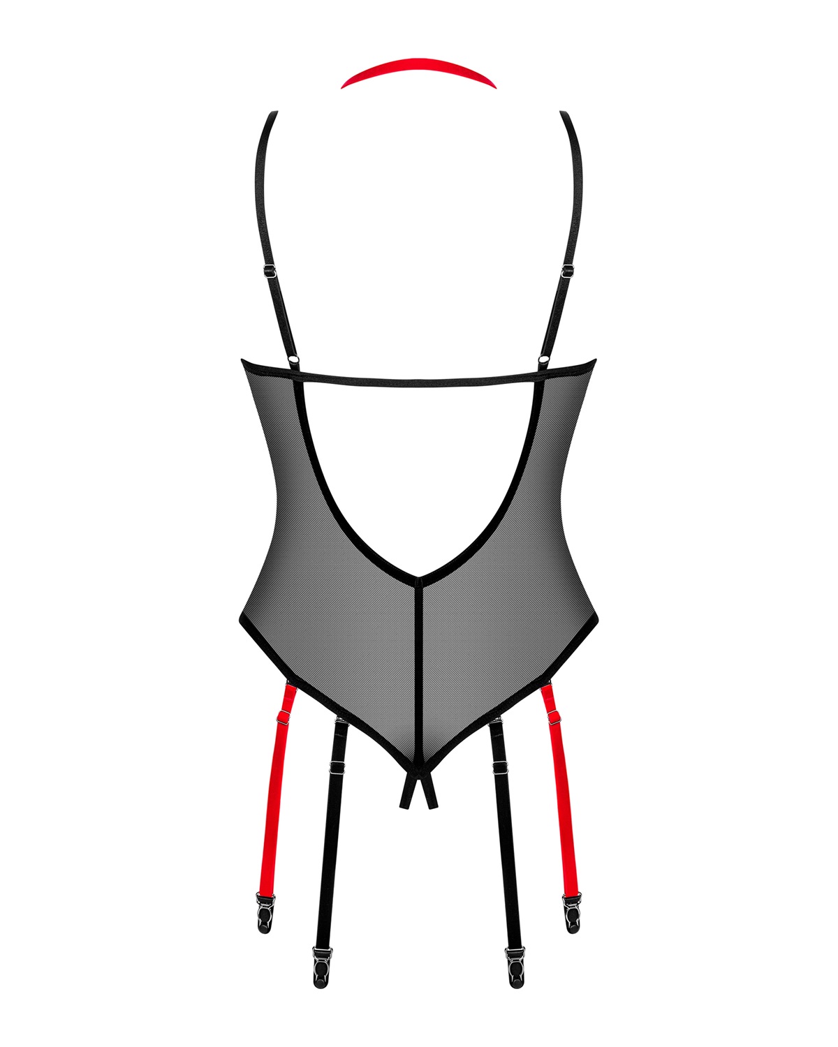 Body aperto in tulle nero con inserti in rosso e stringhe reggicalze.
