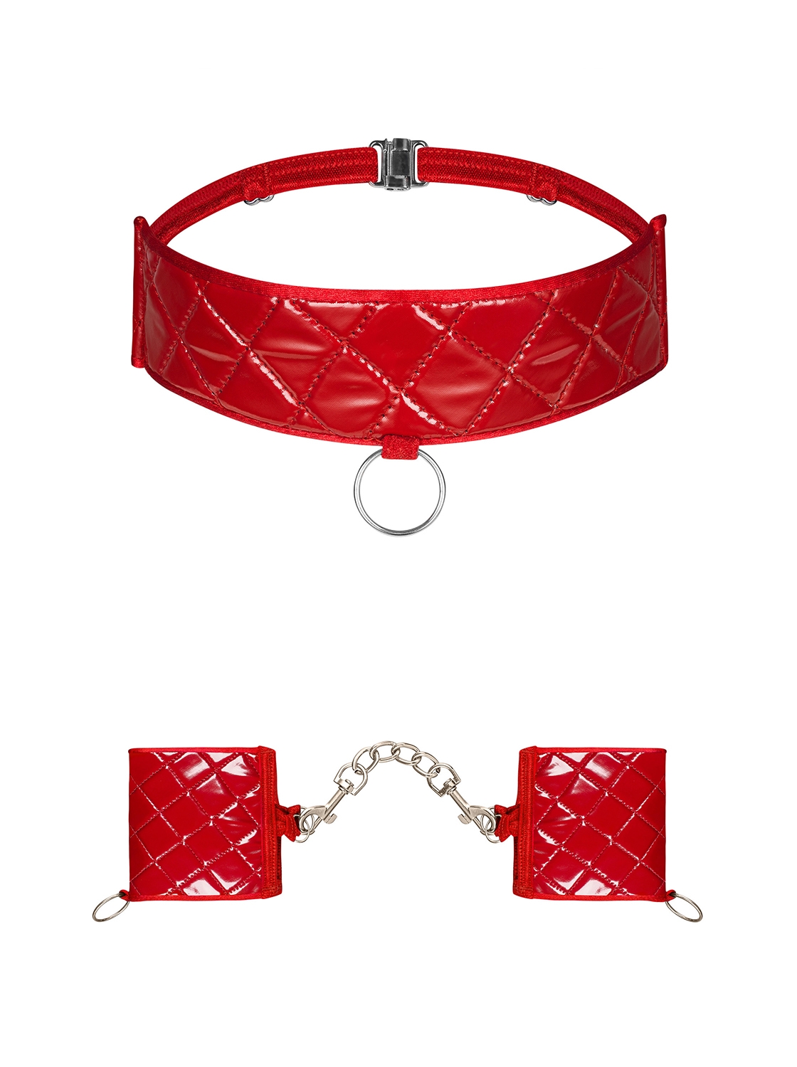 Il set polsiere e collare, in un rosso caldo e seducente, ti condurrà verso notti bollenti.