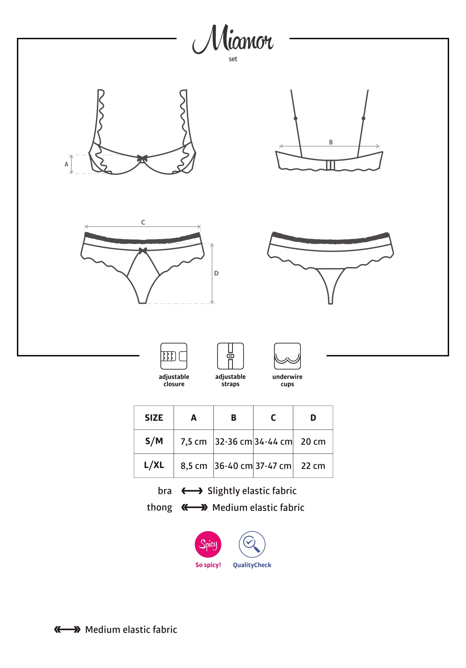 Provocante set due pezzi realizzato in elegante raso bianco con ornamenti in morbido pizzo, che include: -Il reggiseno a mezza coppa, dotato di ferretto e inserti push up estraibili, con spalline realizzate interamente in pizzo. -Le mutandine, che presentano anch’esse graziosi inserti in pizzo.