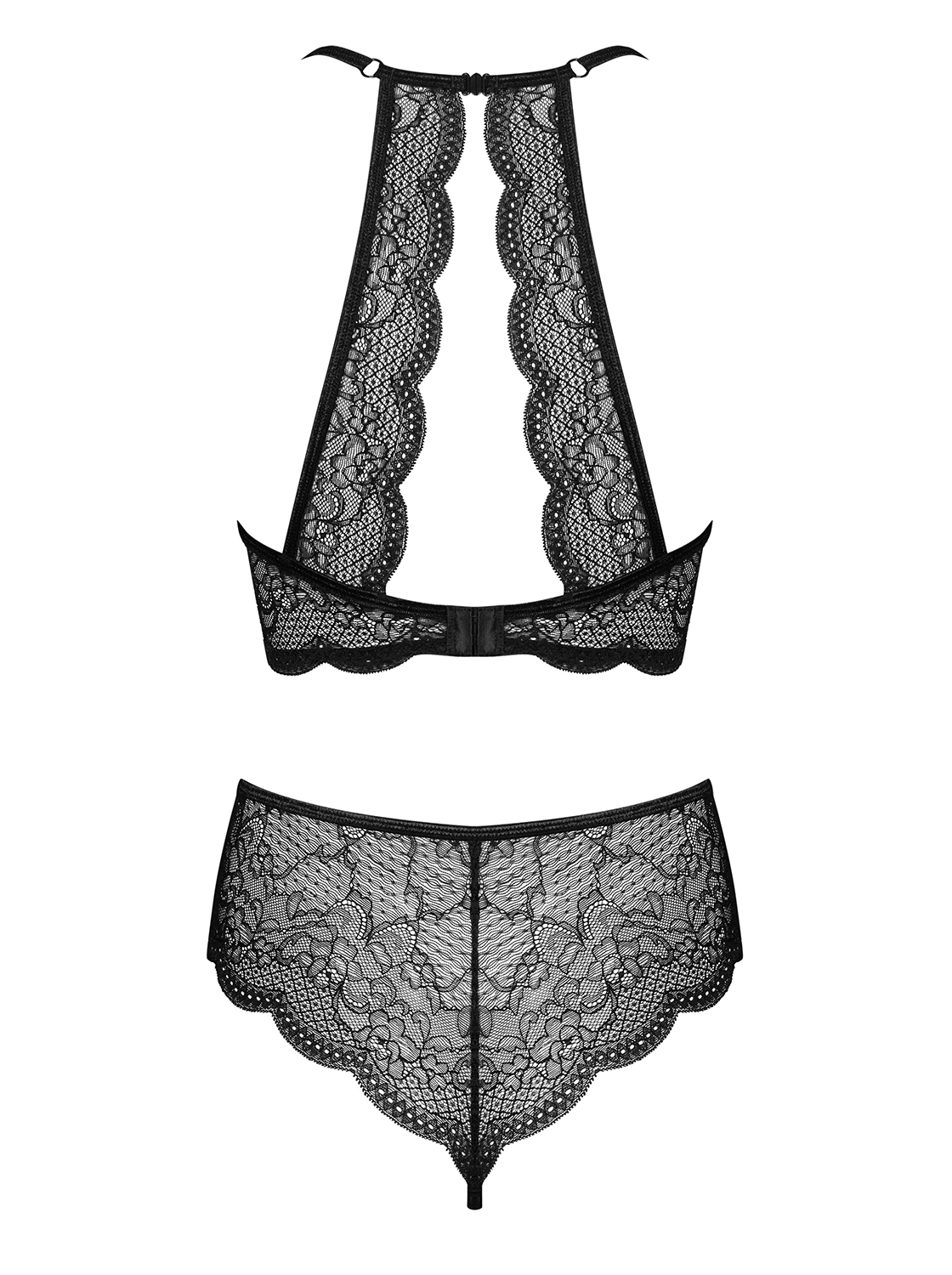 Set aperto in pizzo nero con perle decorative.