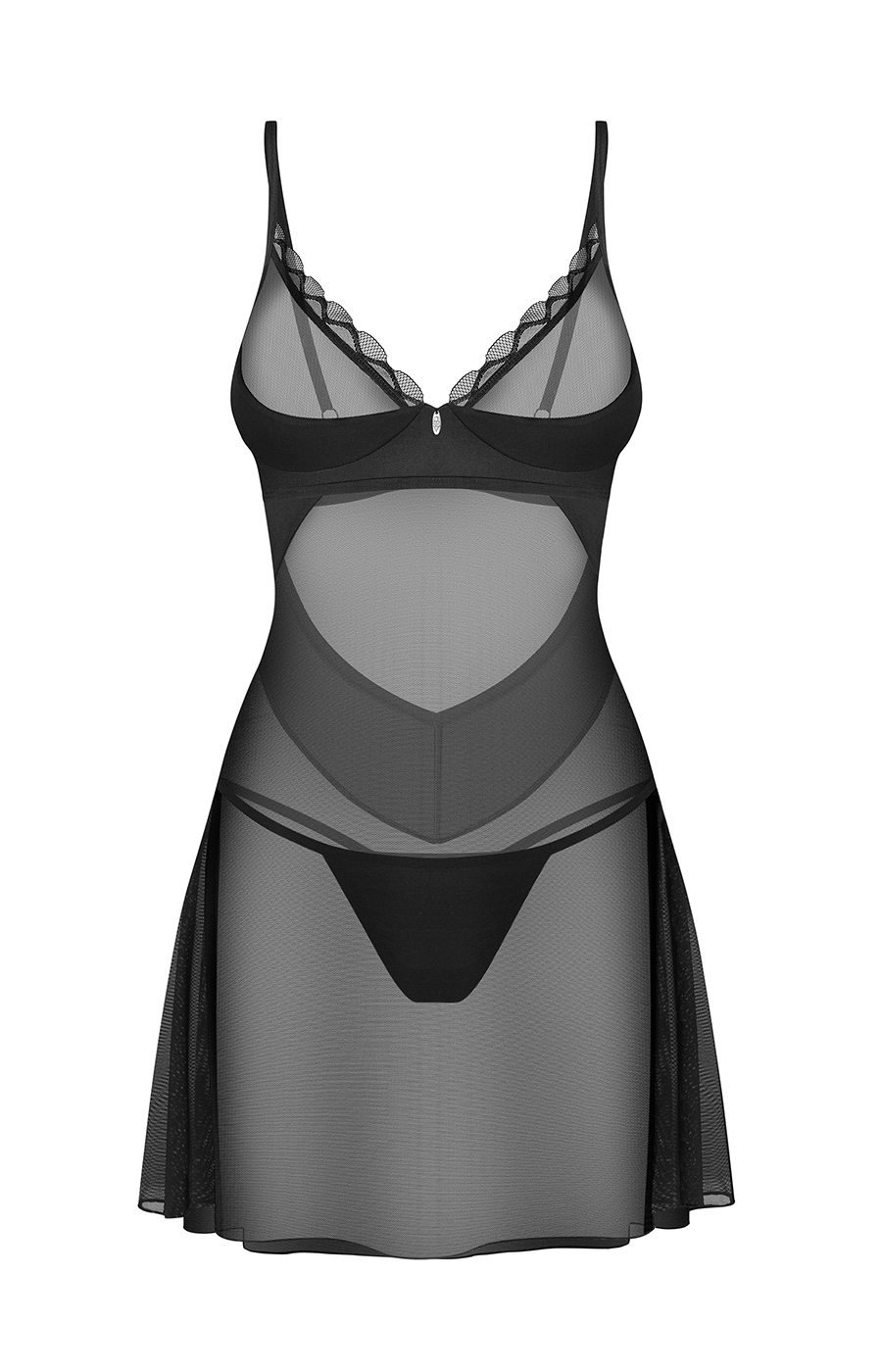 Chemise trasparente con coppe con ferretto, bijoux decorativo e perizoma abbinato.