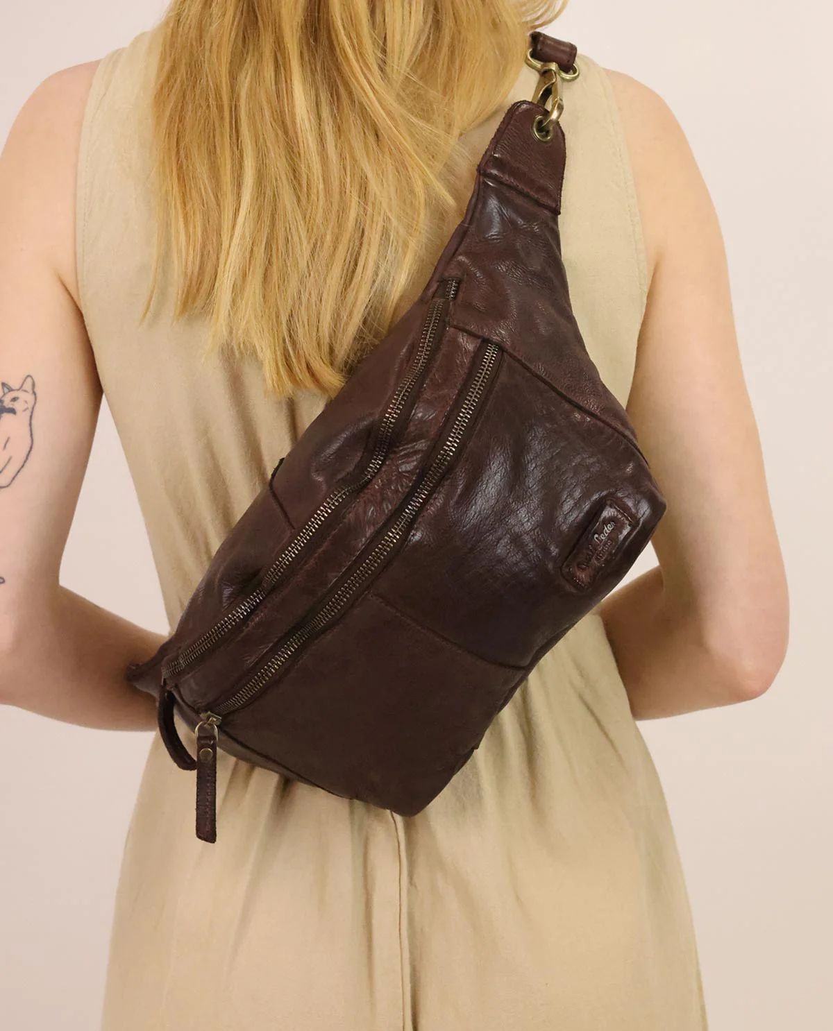 “Freya” è una vera campionessa di spazio tra i marsupi e, grazie alla sua tasca principale e secondaria, offre molto spazio per i tuoi oggetti più importanti. Realizzata in pelle bovina conciata di alta qualità, “Freya” non è solo piacevole al tatto: le due grandi tasche con cerniera offrono spazio sufficiente per cellulare, chiavi, portafoglio, taccuino A5 e tutto ciò che desideri portare con te come souvenir dal prossimo festival. Colpisce per il suo look vintage alla moda e il suo fascino naturale. Vuoi personalizzare “Freya” con una dedica? Nessun problema! All’interno c’è una toppa in pelle dove puoi far incidere un nome o un breve testo. Provala!