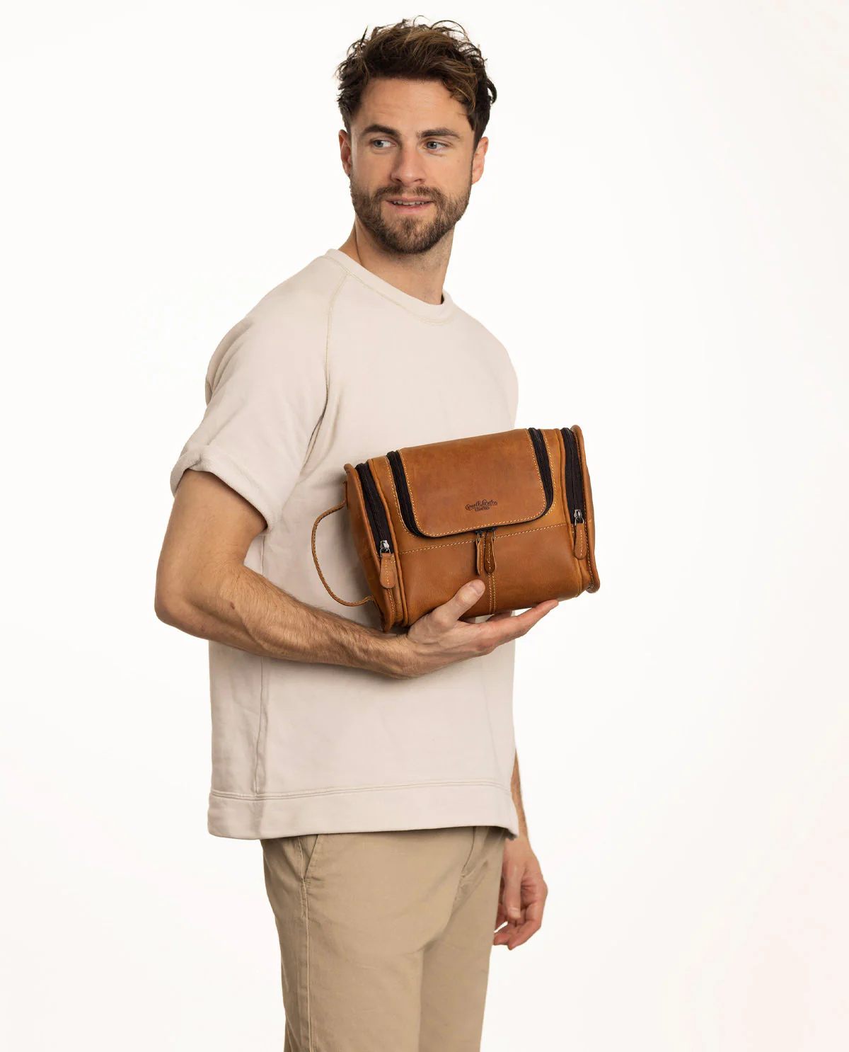 Wärst Du ein kleines Wichtelmännchen, könnte man in dieser Waschtasche super Verstecken spielen. “Chester” bietet unglaublich viele Möglichkeiten, all Deine Hygieneartikel ordentlich zu verstauen. Neben seinen vielseitigen Taschen überzeugt “Chester” auch durch praktische Details: In den beiden Seitentaschen ist alles gut untergebracht, und dank des praktischen Hakens kannst Du die Tasche in jedem Bad dieser Welt sicher aufhängen. Der wasserabweisende Innenraum verzeiht auch kleine Shampoo-Malheure. Inspiriert durch den urbanen Berliner Großstadt Flair kombiniert diese Kulturtasche Funktionalität mit einem stylischen Look. Du hast die Wahl zwischen elegantem Dunkelbraun und modernem Hellbraun – was will man mehr? Mit “Chester” bist Du auf Reisen immer bestens ausgestattet.